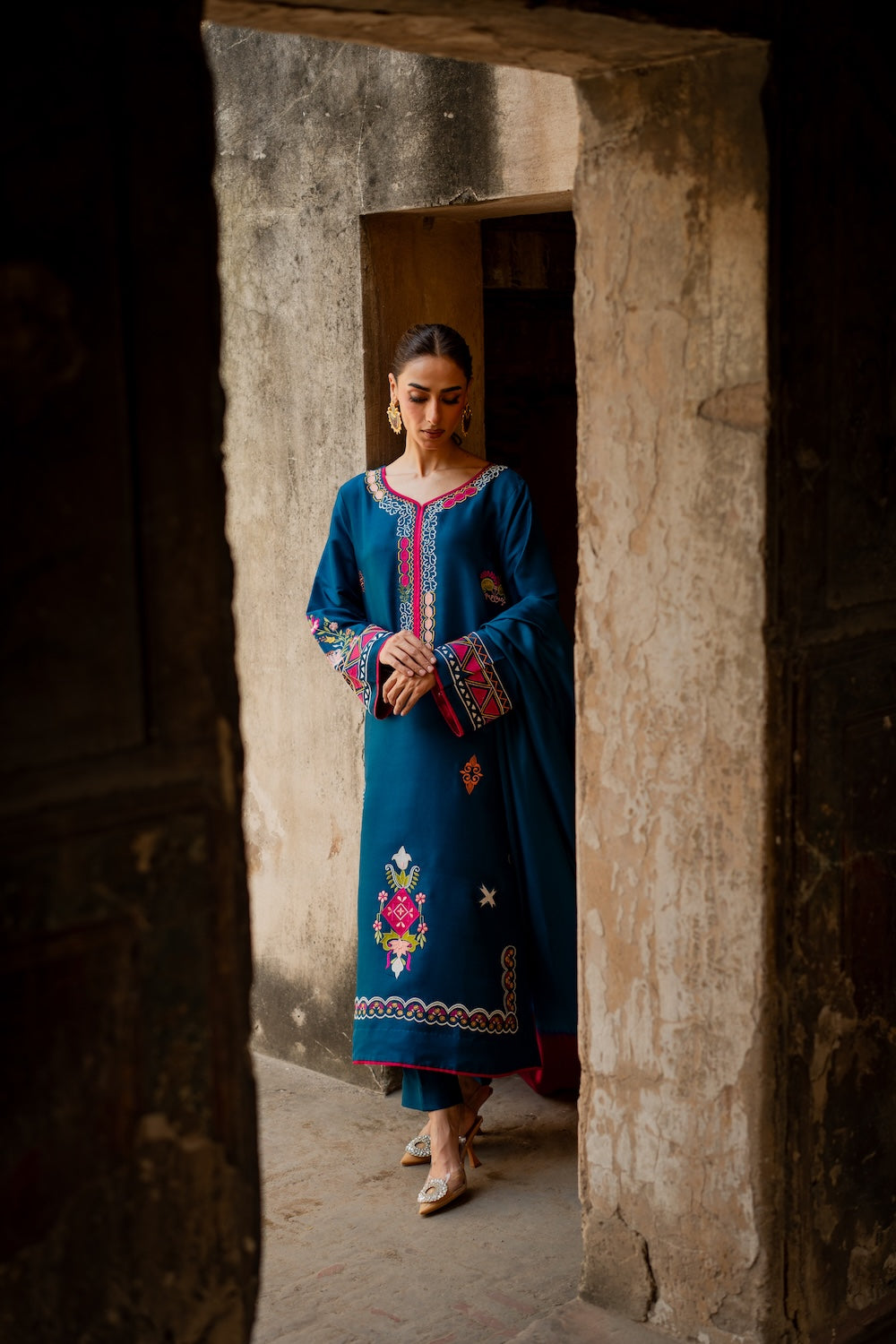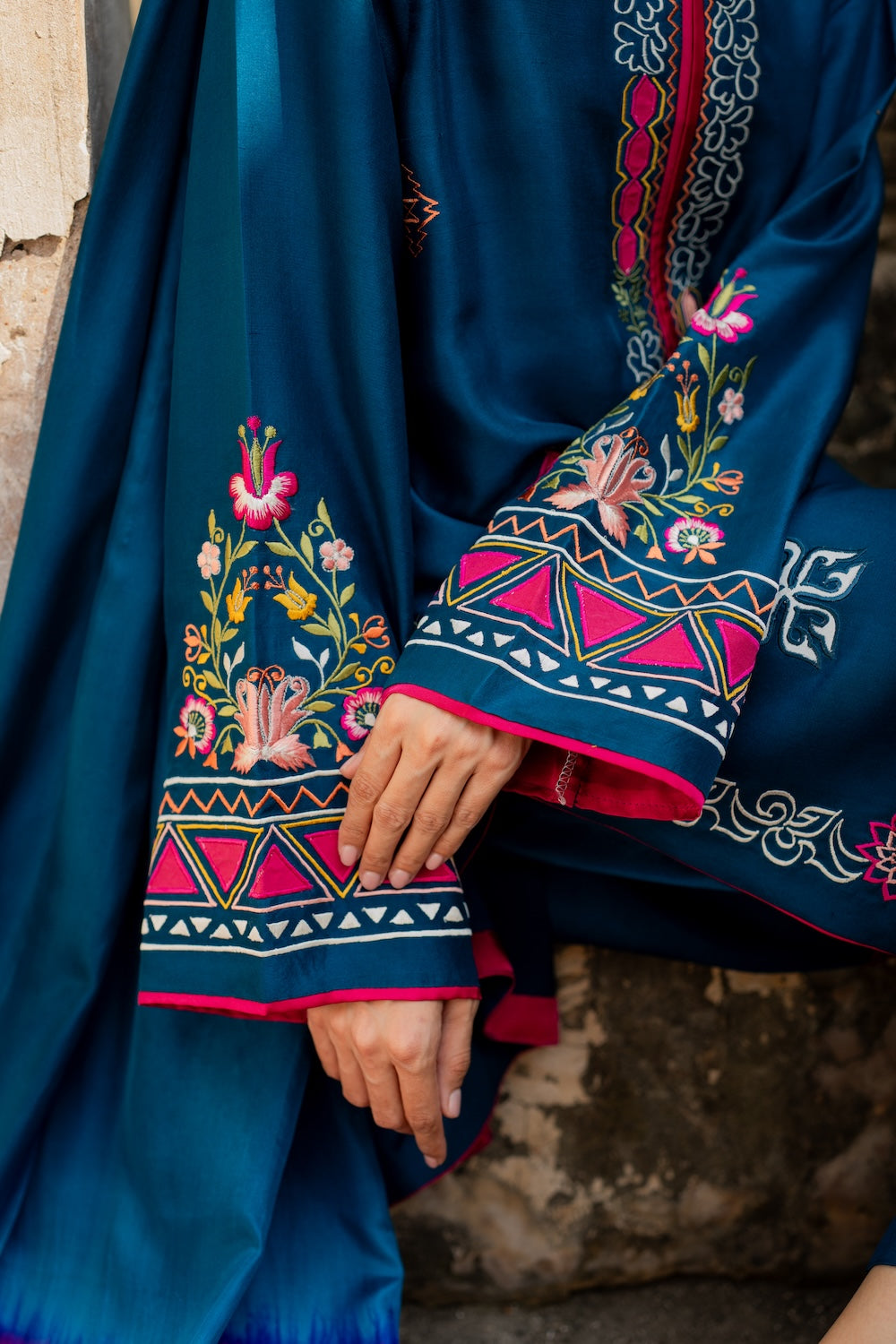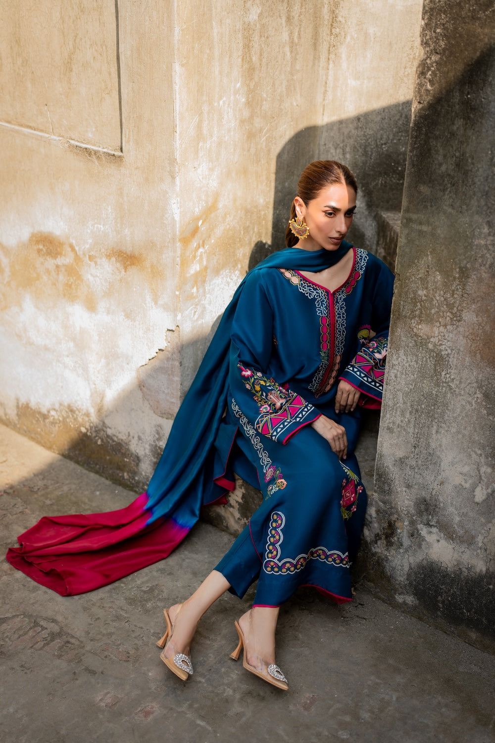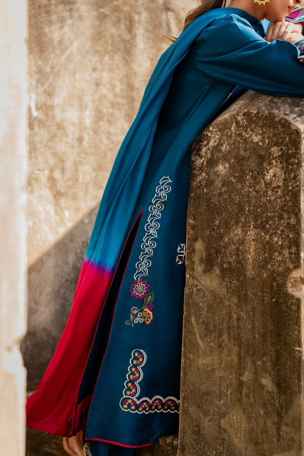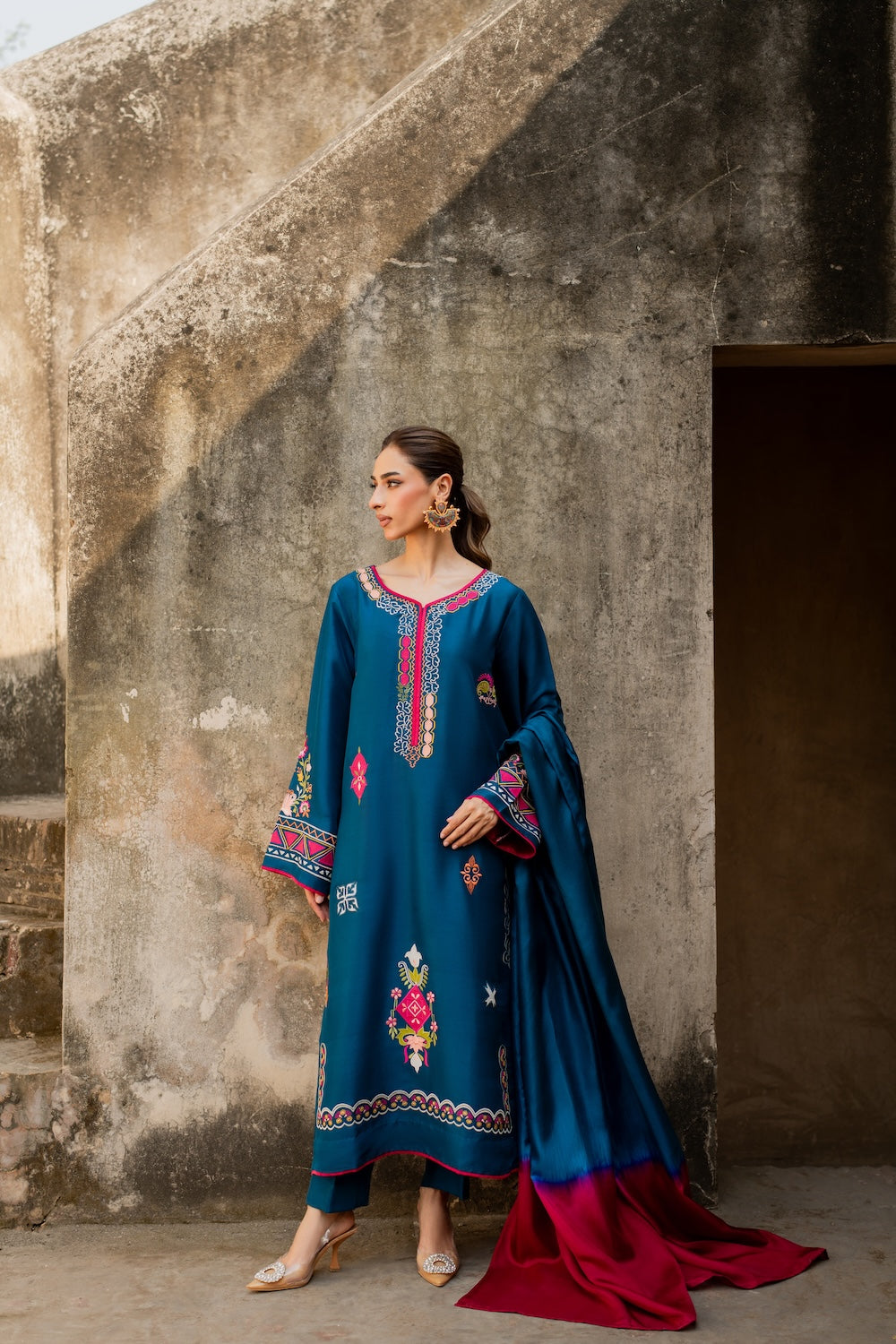 Daniya is a stunning tribute to tradition—a two‑piece sheesha silk ensemble adorned with luxurious pink‑and‑green embroidery. Its minimal design lets the intricate craftsmanship shine, while a paired pure‑silk, two‑toned dupatta completes the look, making it an ideal choice for evening dinners