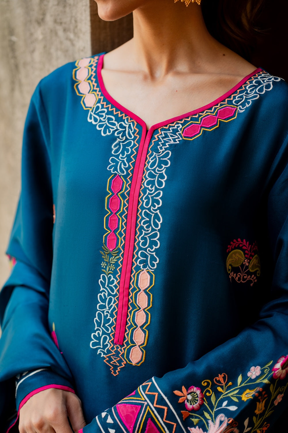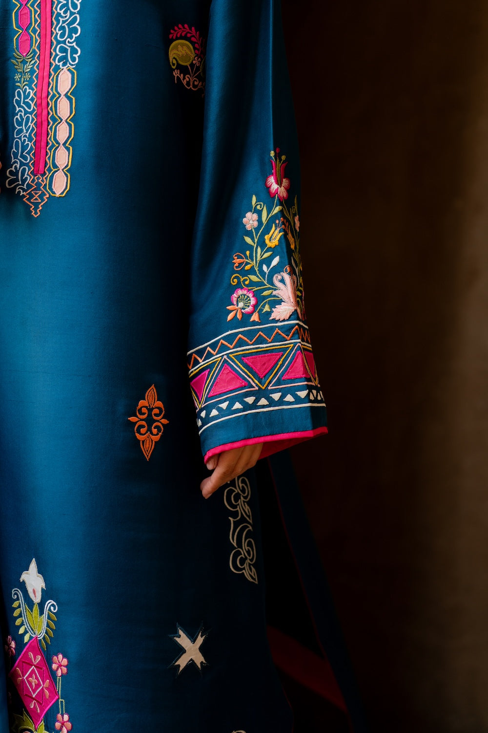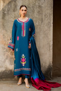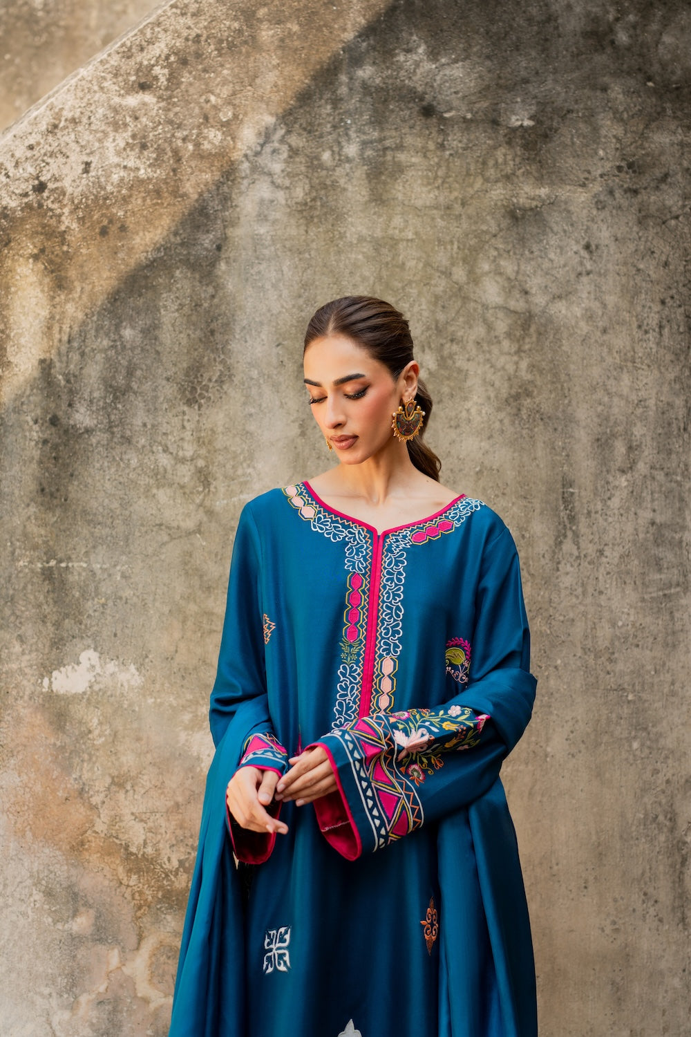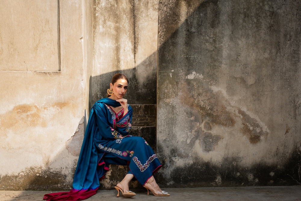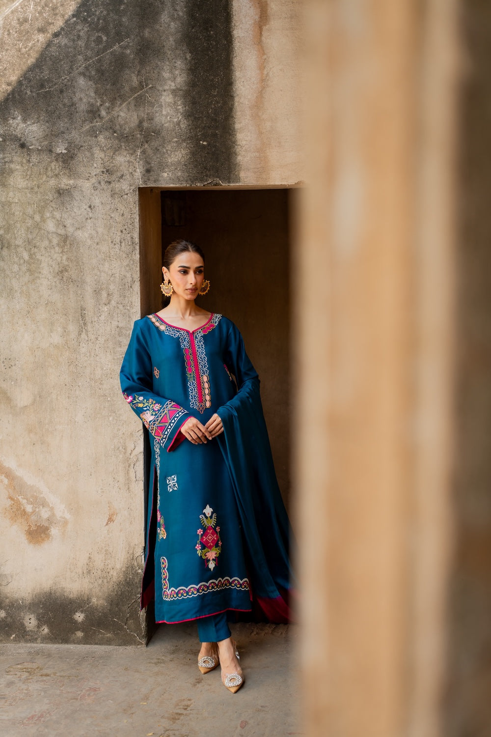 Daniya is a stunning tribute to tradition—a two‑piece sheesha silk ensemble adorned with luxurious pink‑and‑green embroidery. Its minimal design lets the intricate craftsmanship shine, while a paired pure‑silk, two‑toned dupatta completes the look, making it an ideal choice for evening dinners