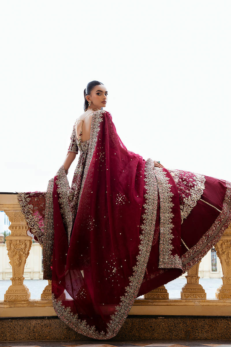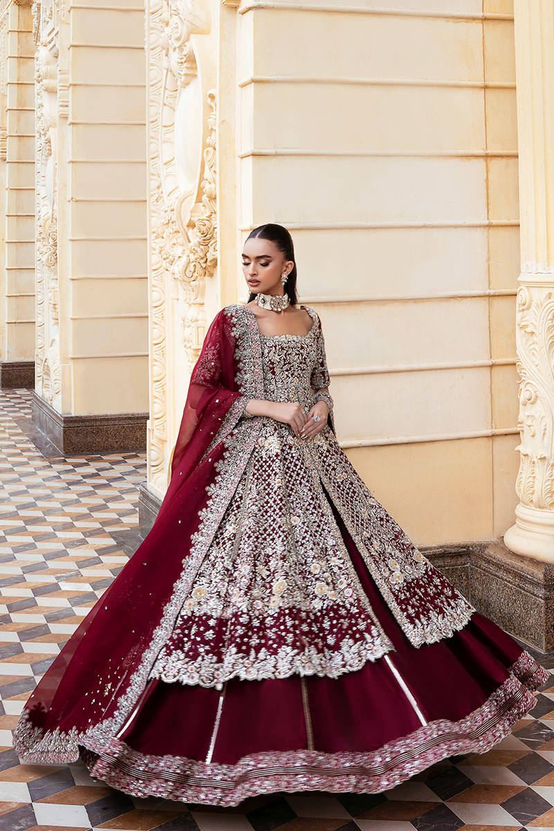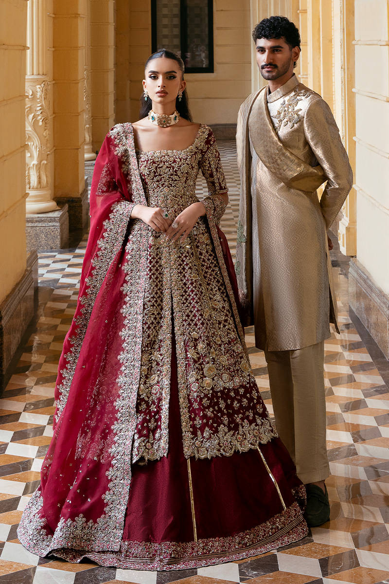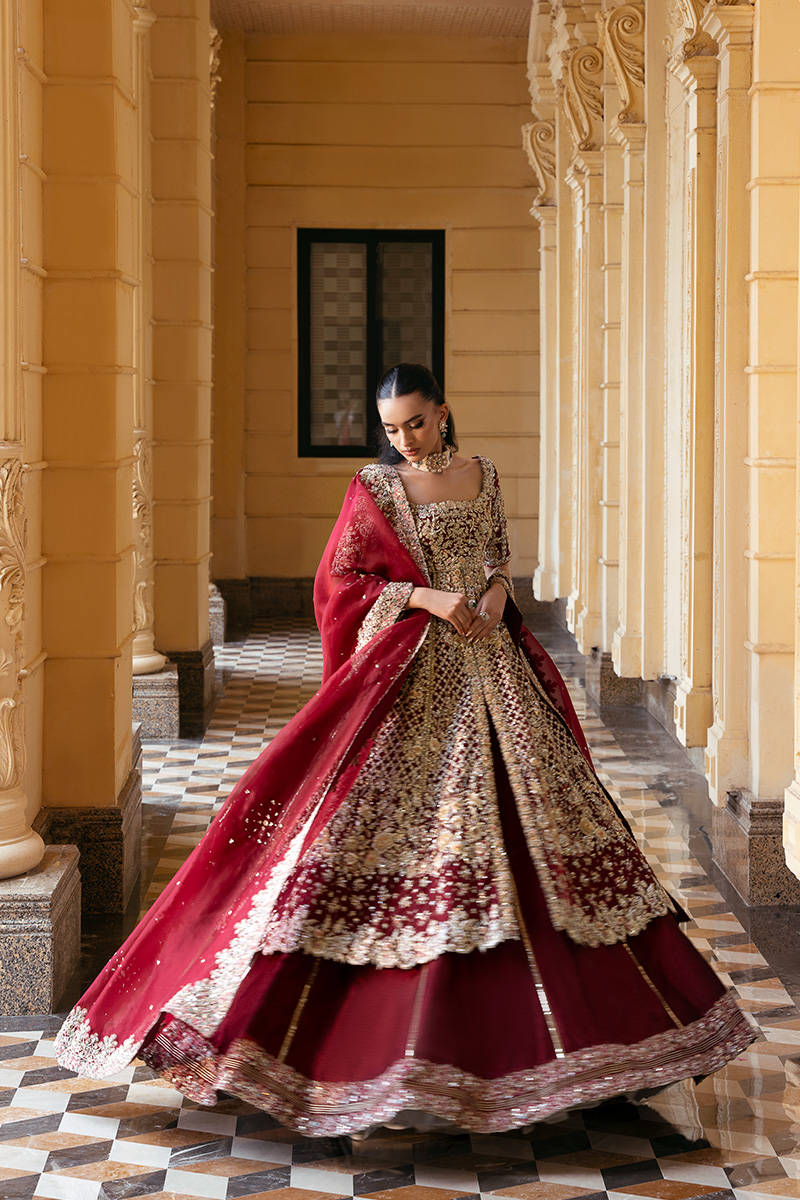 An immaculate vision of grandeur, this deep red front-open net kalidar is the epitome of bridal elegance, making it the perfect choice for a barat ensemble. Adorned with exquisite hand embellishments in dabka, mukaish, zari, and resham, the silhouette exudes timeless sophistication. It is paired with a raw silk lehenga in matching deep red, highlighted with delicate gota and hand-embellished finishing along the hem. The look is completed with an organza dupatta featuring opulent borders, intricately detailed with zardozi, dabka, and Swarovski accents, radiating a truly regal charm.