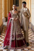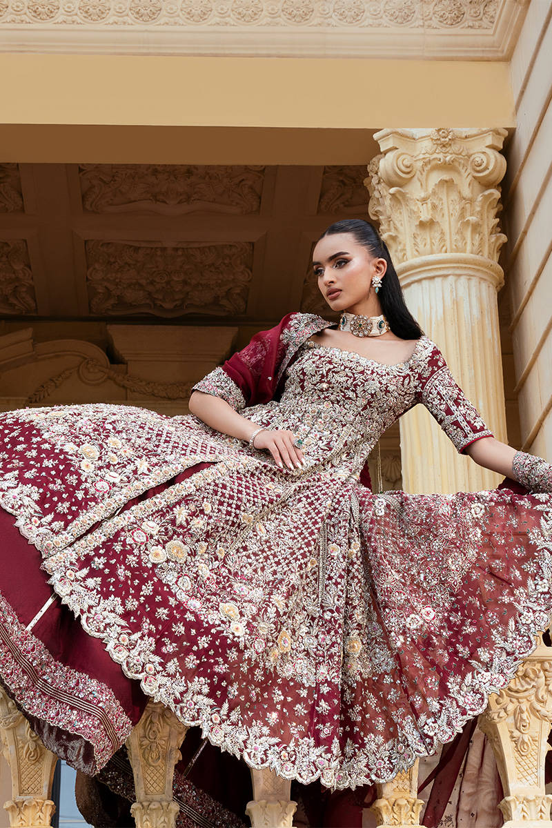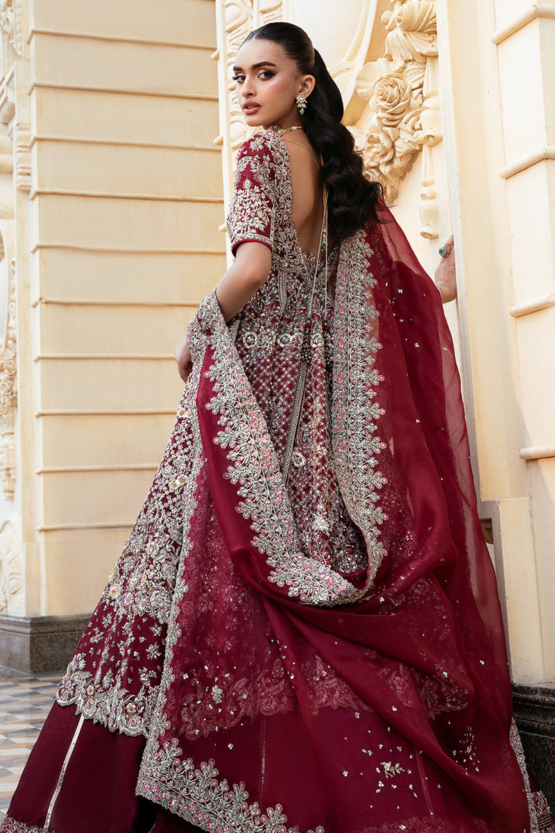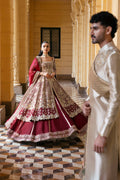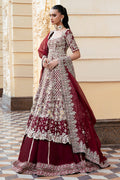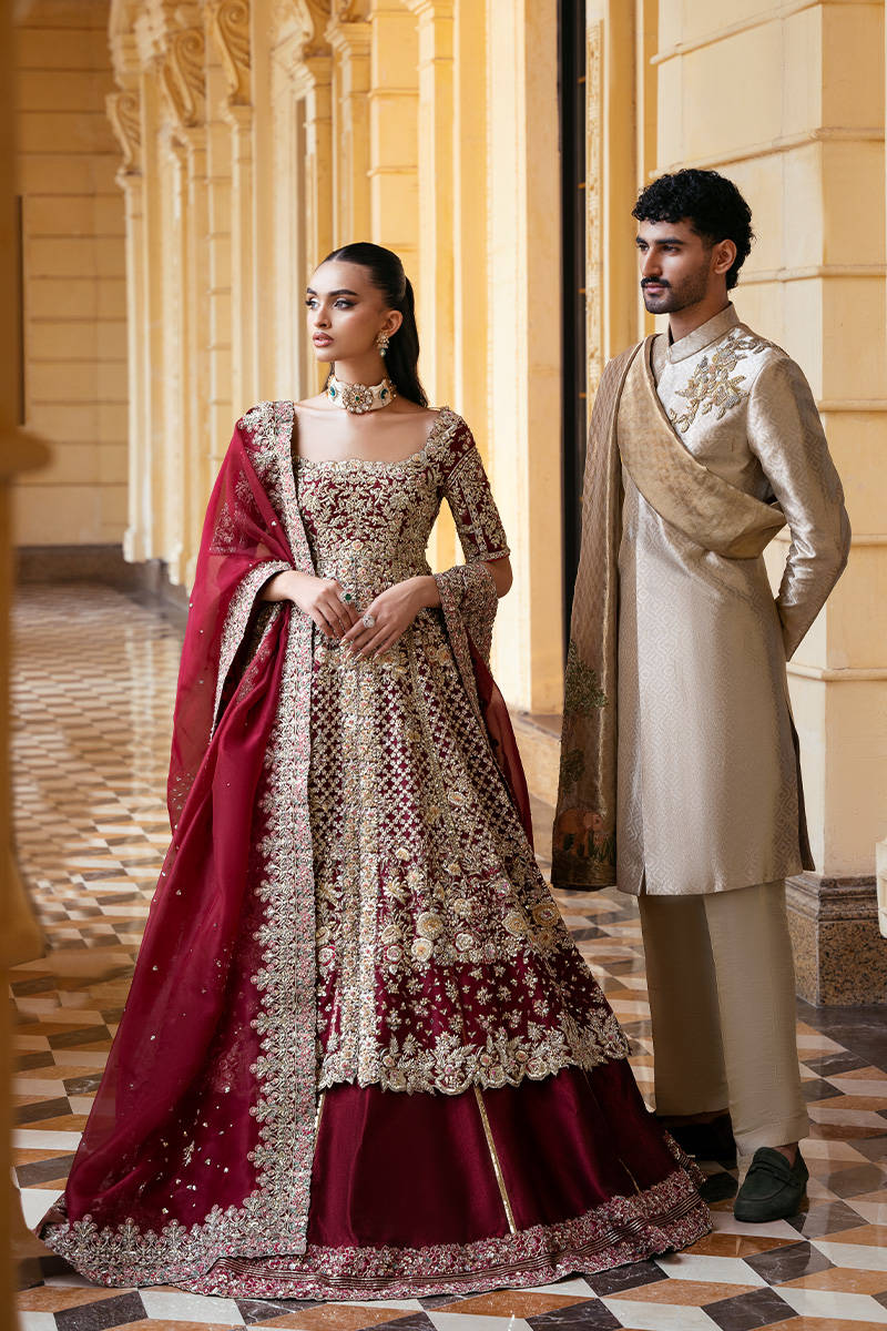 An immaculate vision of grandeur, this deep red front-open net kalidar is the epitome of bridal elegance, making it the perfect choice for a barat ensemble. Adorned with exquisite hand embellishments in dabka, mukaish, zari, and resham, the silhouette exudes timeless sophistication. It is paired with a raw silk lehenga in matching deep red, highlighted with delicate gota and hand-embellished finishing along the hem. The look is completed with an organza dupatta featuring opulent borders, intricately detailed with zardozi, dabka, and Swarovski accents, radiating a truly regal charm.