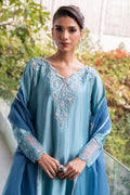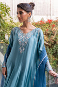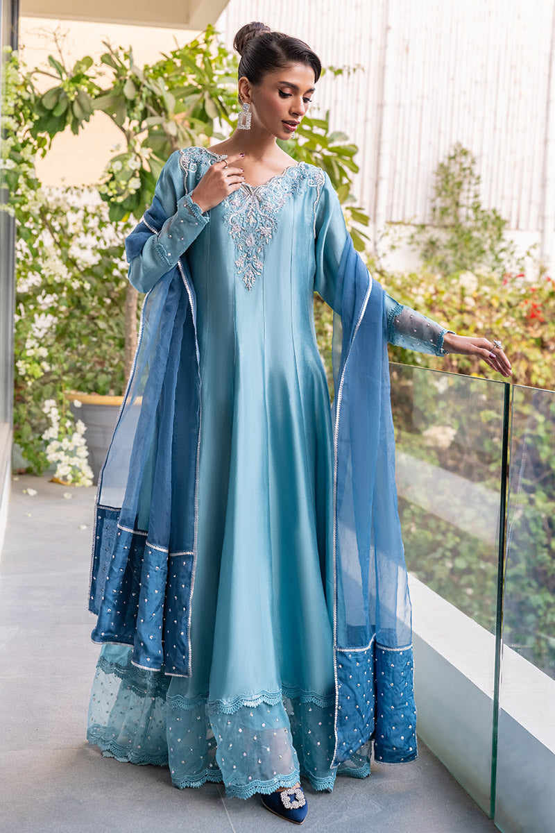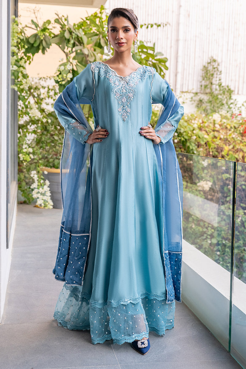 This stunning Denim Blue Kalidar frock is crafted from luxurious pure sheesha silk, enhanced with delicate organza borders. Paired with straight pants, the ensemble is completed by a contrasting blue embellished organza dupatta for added elegance. The intricately adorned neckline features kora, pearls, French knots, crystals, and stones, creating a captivating focal point.