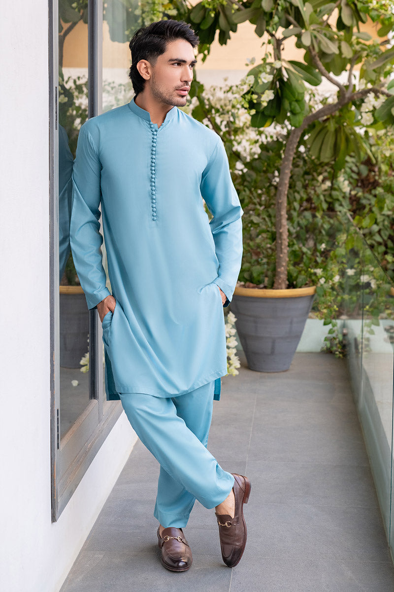 Introducing an exquisite ensemble featuring a prince coat crafted from embroidered raw silk, paired with a wrinkle-free polycotton shirt and matching pants. This outfit seamlessly blends elegance and functionality, making it perfect for formal occasions. The intricate embroidery on the coat adds a touch of sophistication, while the polycotton fabric ensures a neat and polished look.