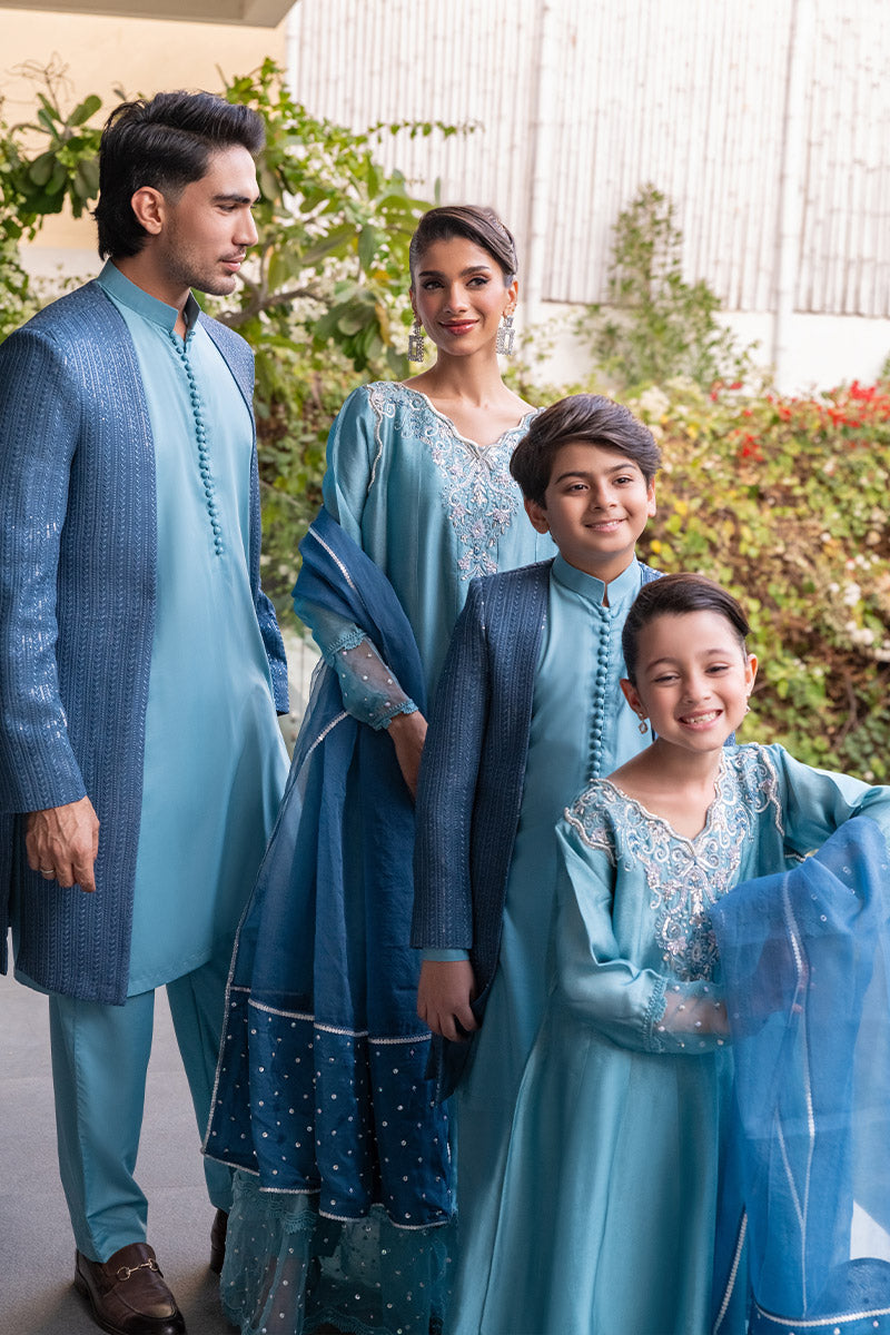 Presenting a sophisticated ensemble featuring a prince coat crafted from embroidered raw silk, complemented by a wrinkle-free polycotton shirt and matching pants. This outfit seamlessly blends elegance and comfort, making it perfect for special occasions. The exquisite embroidery on the coat adds a luxurious touch, while the polycotton fabric ensures a neat and stylish appearance.