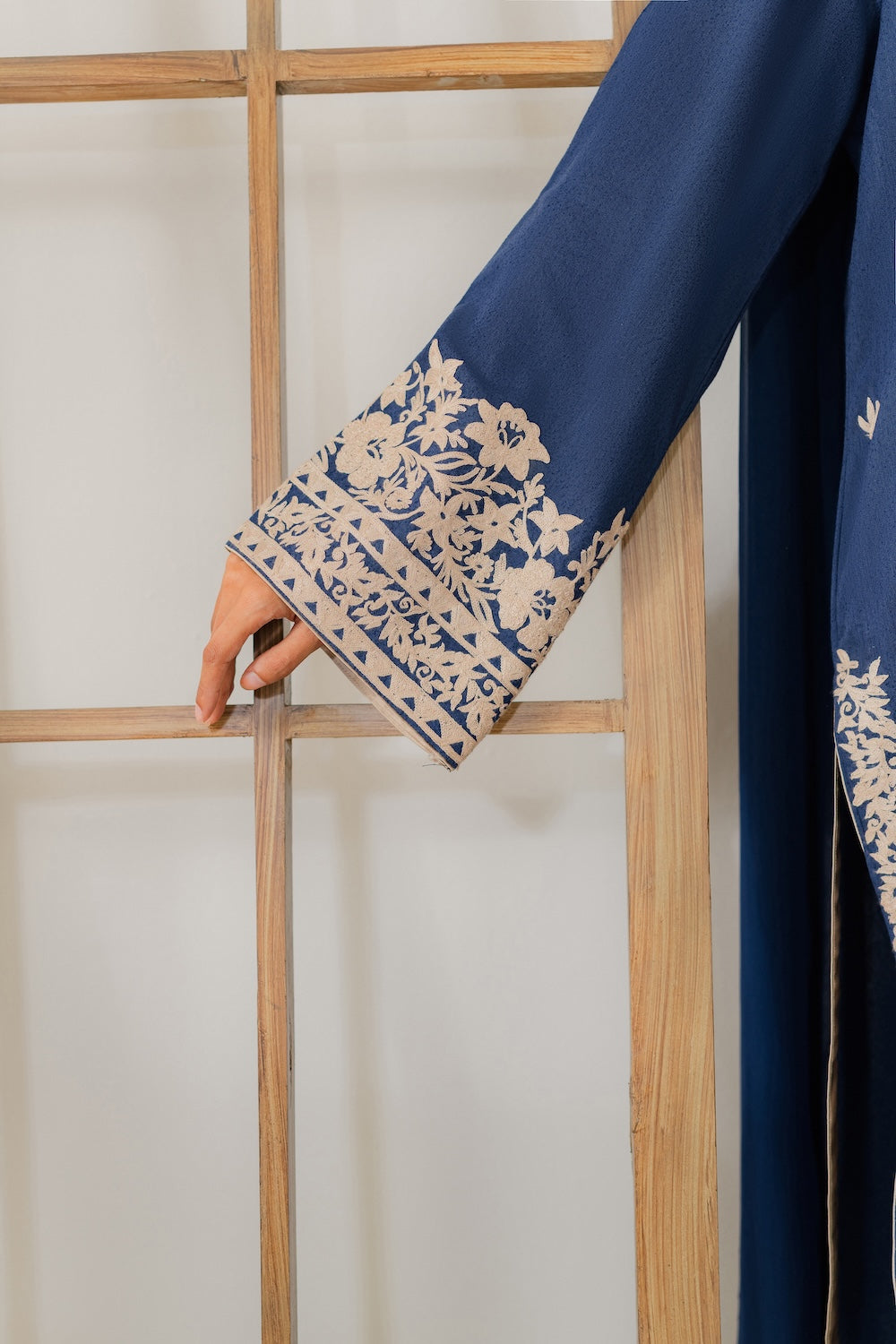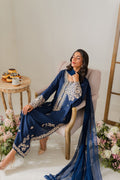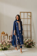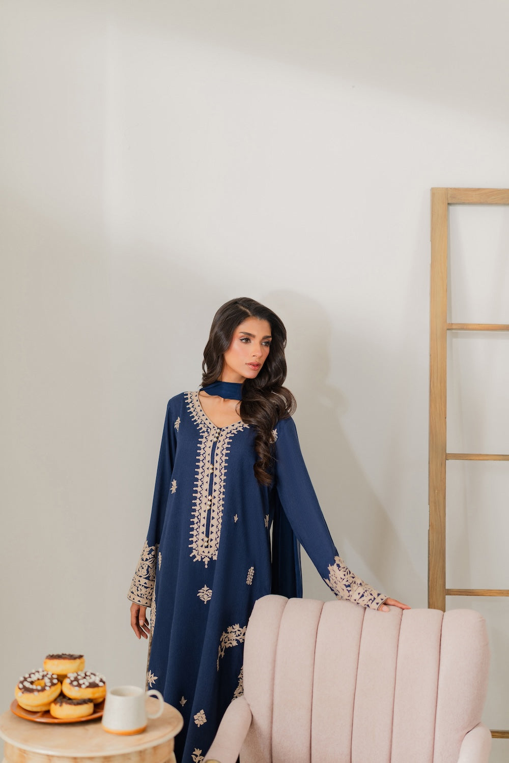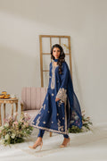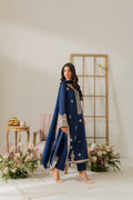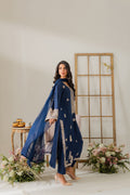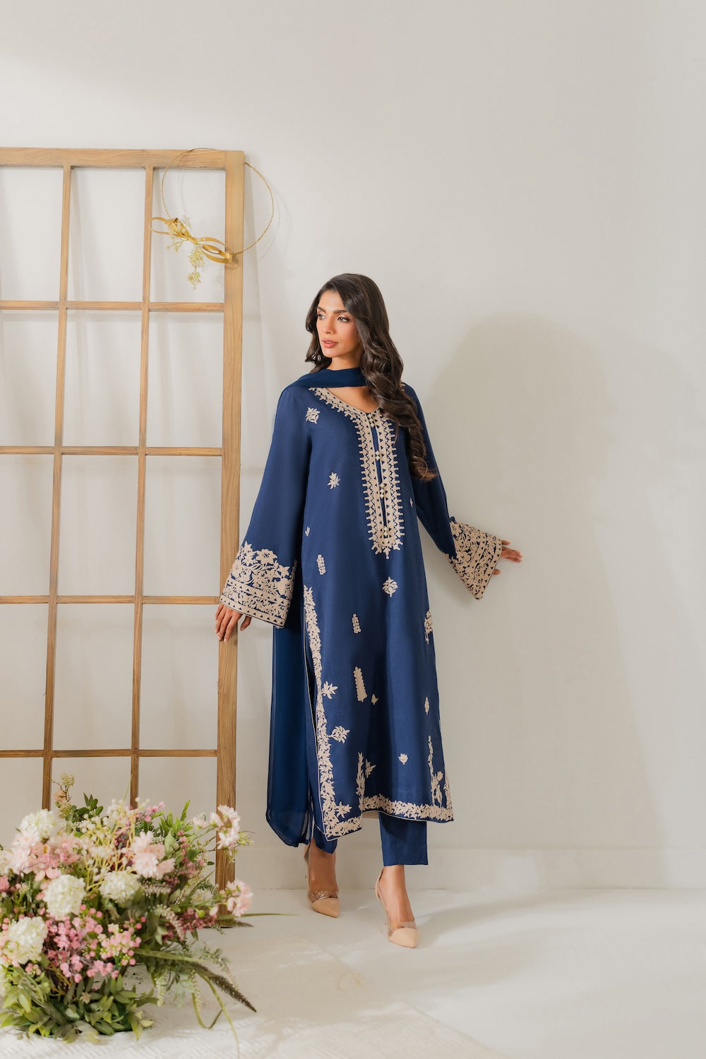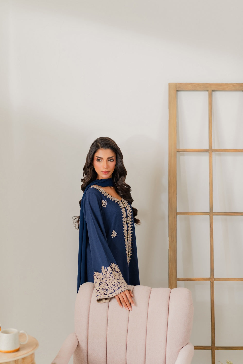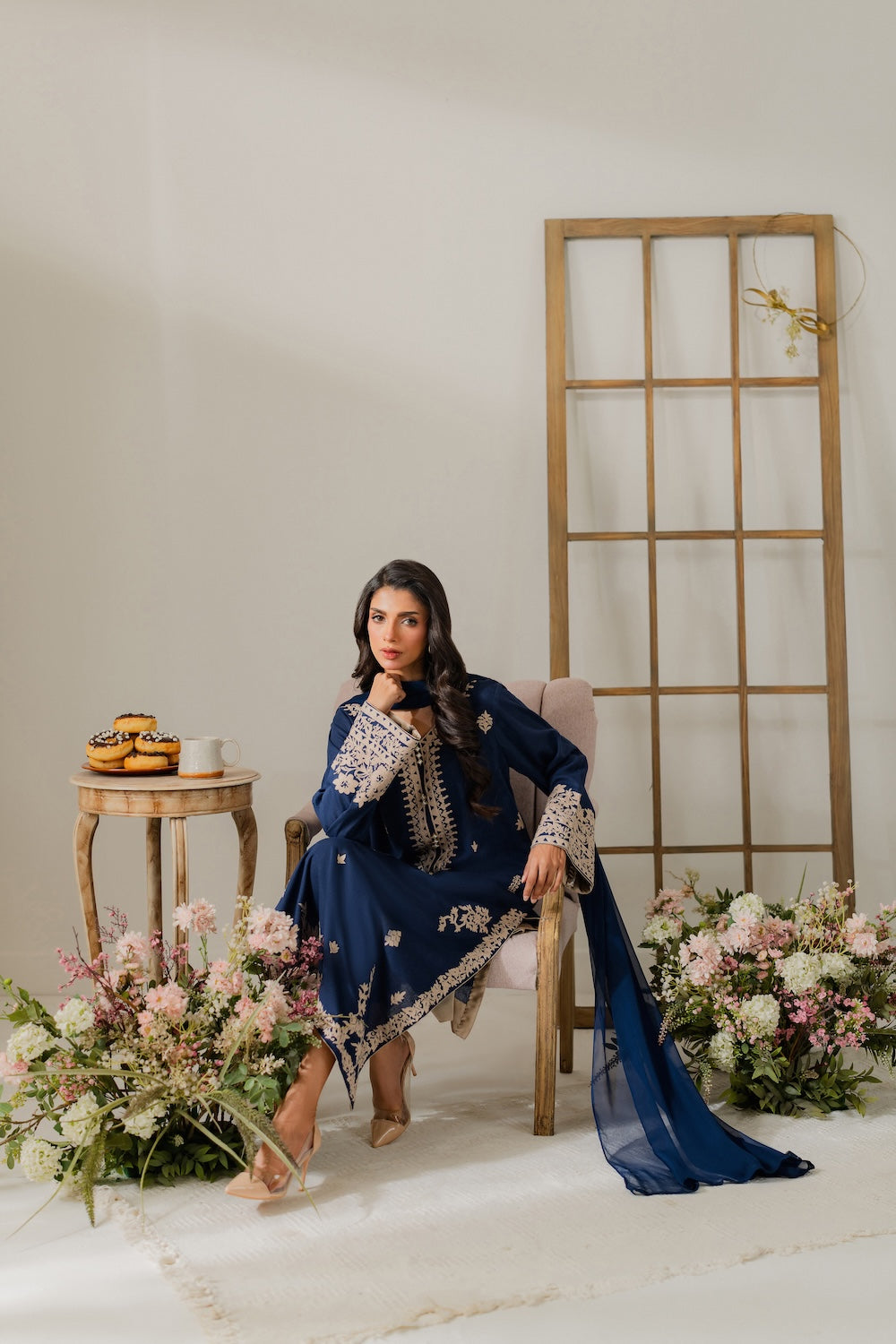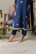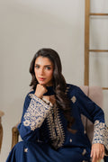 This sophisticated dark blue two-piece features delicate hand aari embroidery in an elegant geometric pattern intricately covering the shirt. The refined craftsmanship adds depth and texture, perfect for formal occasions. A matching dupatta is available separately to complete the ensemble.