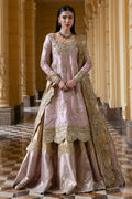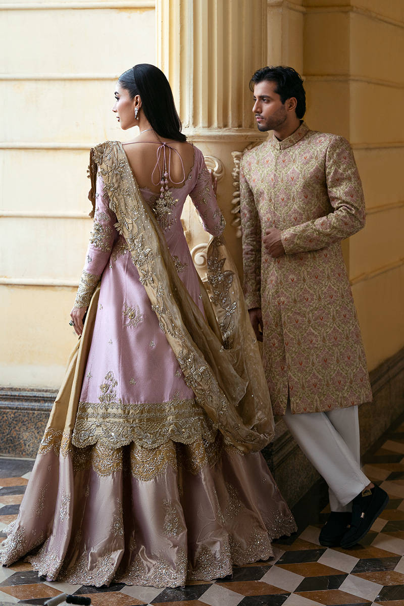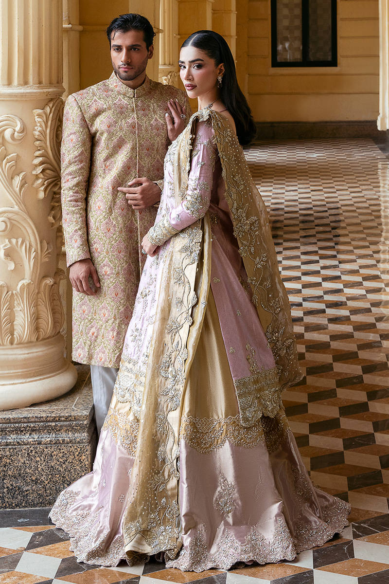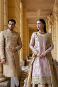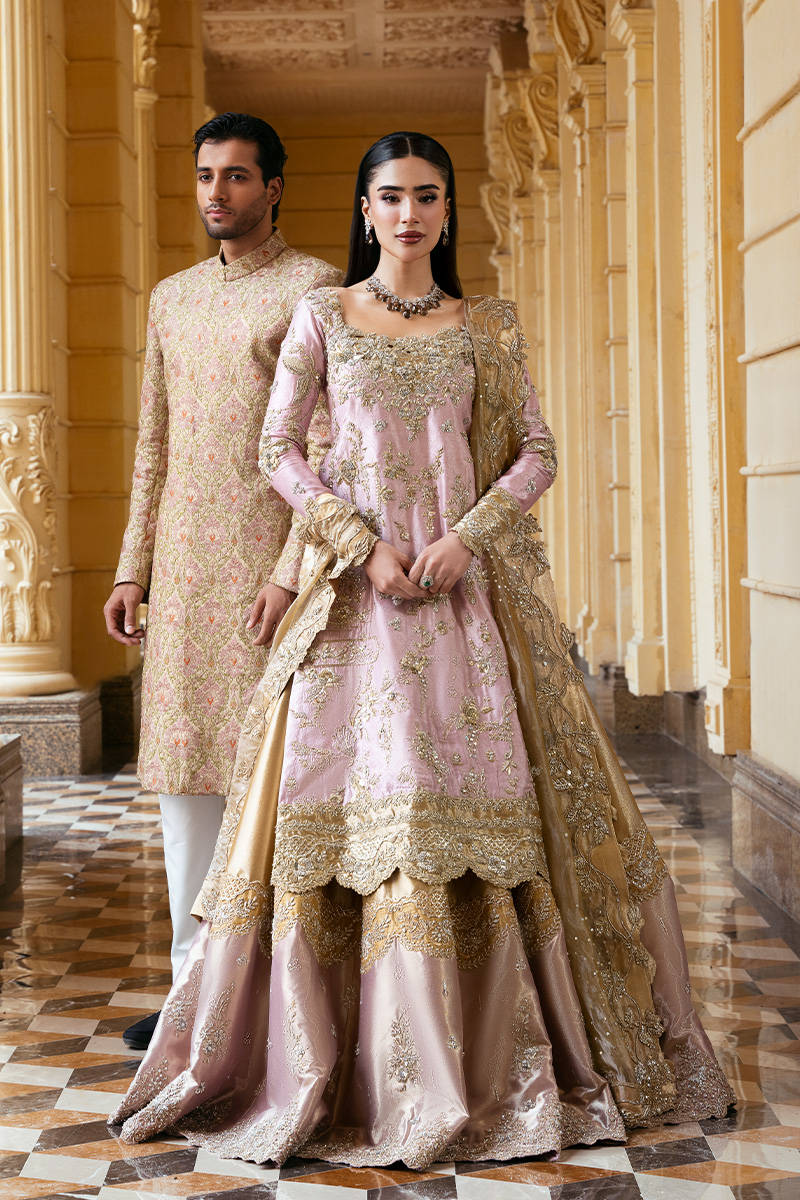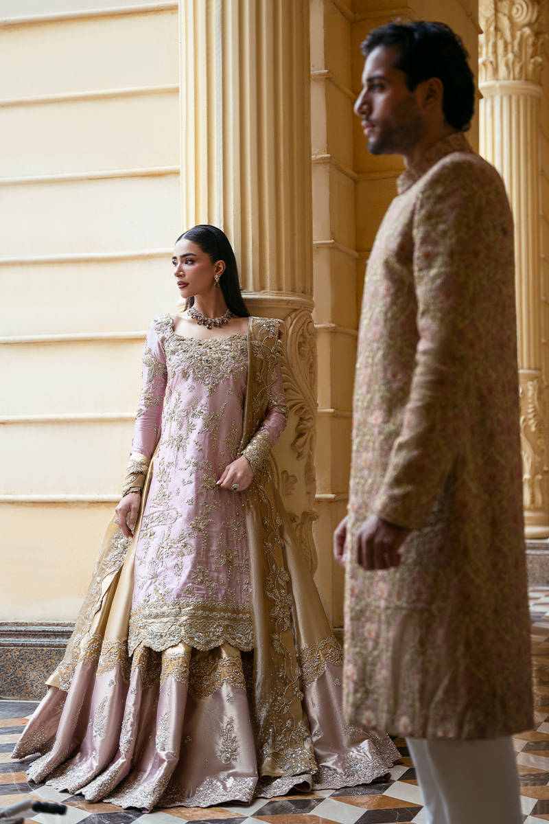 An enchanting pastel pink and gold self-tissue silk shirt, adorned with intricate embroidery and delicate dabka, zardozi, and mukaish work, crafted to perfection for the bride who cherishes timeless detail. The fitted full sleeves lend the silhouette a sleek and refined finish. Paired with a matching tissue lehenga showcasing exquisite craftsmanship, the look is elevated with an ethereal organza dupatta, beautifully detailed with sequin sprays and hand-embellished boti chaan, creating a harmonious balance of elegance and grandeur.