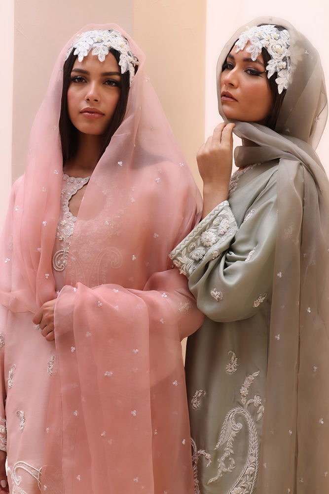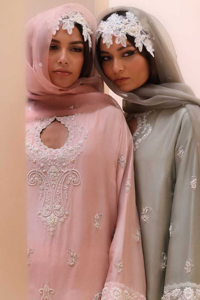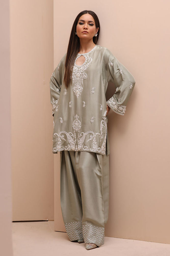 Timeless Elegance in Desert Sage – This luxurious ensemble is crafted from Pure Raw Silk for the Shirt and Shalwar, complemented by a delicate Pure Organza Dupatta. Adorned with intricate all-over Ivory Resham and Lorix embroidery, it features exquisite handwork detailing with Moti, Crystals, Tikki Stones, Sequins, Cutdana, and Pearls. The ensemble is further enhanced with a sequins handwork border, while the dupatta showcases all-over sequins chan with crystal hangings on the pallu, exuding sophistication and charm.