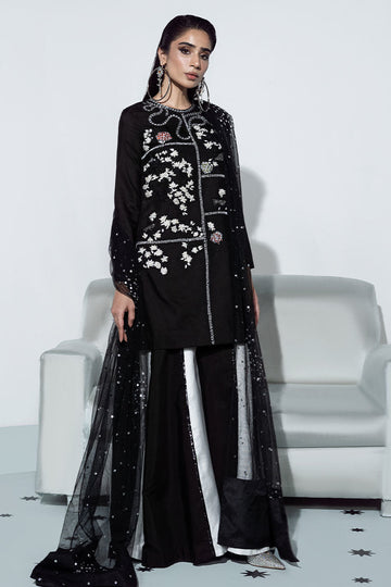 Presenting "Eclipse," a stunning black outfit made from opulent Thai silk and exquisite net fabric. The eye-catching shirt features an array of machine- and hand-crafted elements, paired with panelled flared pants. Eclipse displays vigilant artistry and represents enduring beauty. Eclipse is a wonderful choice that inspires and makes an impression with comfort; embrace refined elegance with it.