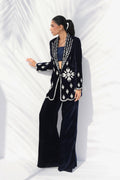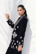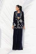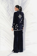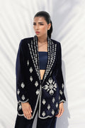 This rich midnight blue velvet ensemble exudes regal elegance, with intricate zardoze embroidery tracing the blazer’s edges and hem in a striking contrast against the deep hue. The jacket’s sharp tailoring defines a structured yet feminine silhouette, paired with a matching charmeuse tube top. The velvet drapes beautifully, complementing the sleek trousers, with a side slit, for a seamless fusion of contemporary tailoring and classic detailing.