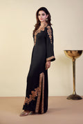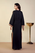 This sophisticated black kaftan radiates elegance with its intricate golden embroidery. The long, flowing silhouette is adorned with detailed embroidered neckline, sleeves, and hem, adding a regal touch to the outfit. The warm golden tones contrast beautifully against the deep black fabric, creating a timeless and luxurious appeal.