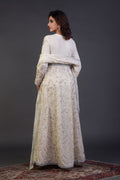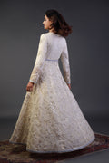 This exquisite front-open ensemble exudes timeless elegance, crafted from luxurious fabric in a soft ivory hue. The intricate embellishments feature delicate hand embroidery in silver and gold, shimmering sequins, and glistening beadwork, creating a mesmerizing effect. The structured silhouette is adorned with Mughal-inspired patterns, enhancing its regal charm. A subtle silver-lined border traces the neckline, front panel, and hem, adding a sophisticated touch. The sheer dupatta, finished with embroidered edges, drapes effortlessly to complete the graceful look. Perfect for weddings, receptions, and grand festive occasions, this masterpiece blends traditional craftsmanship with contemporary sophistication.
