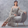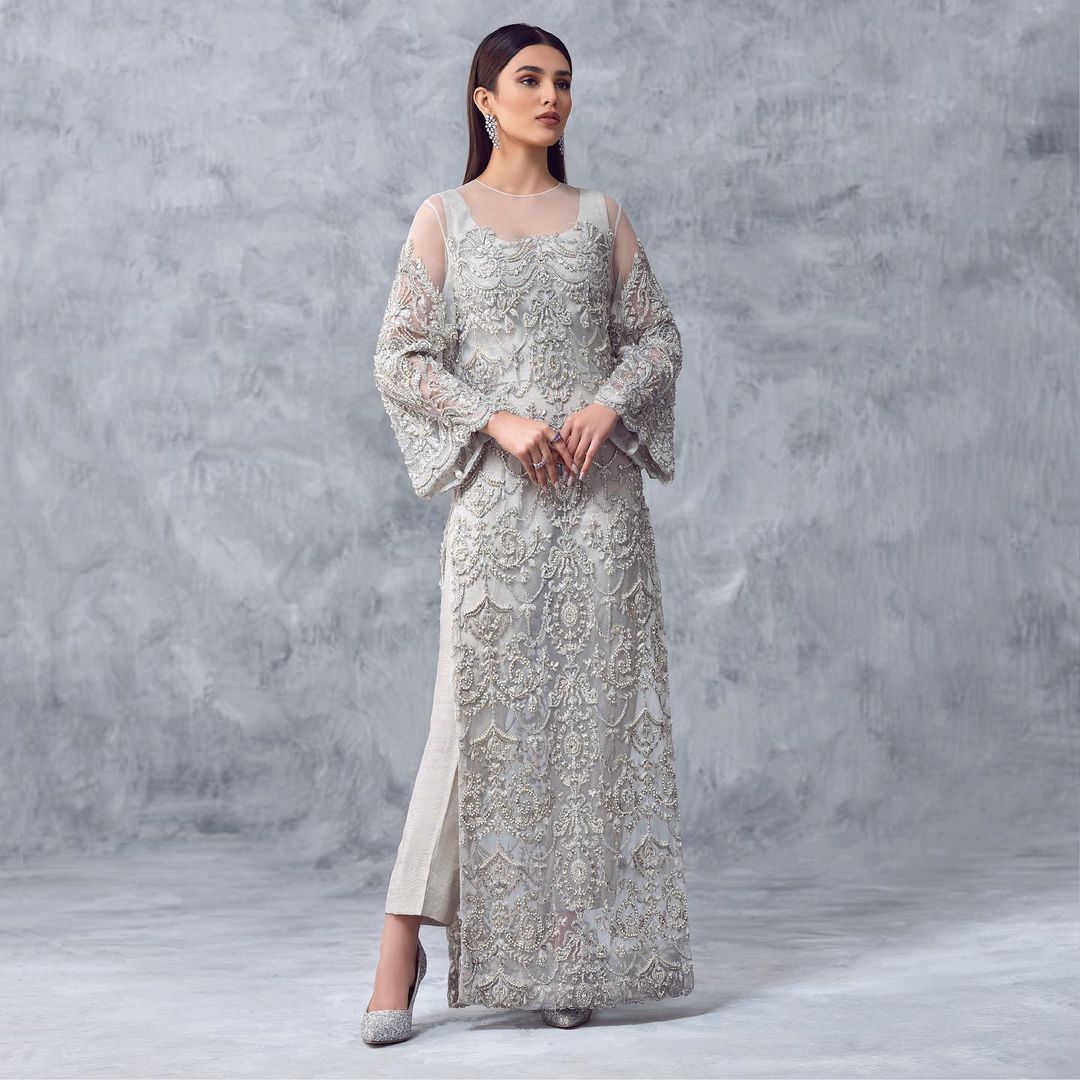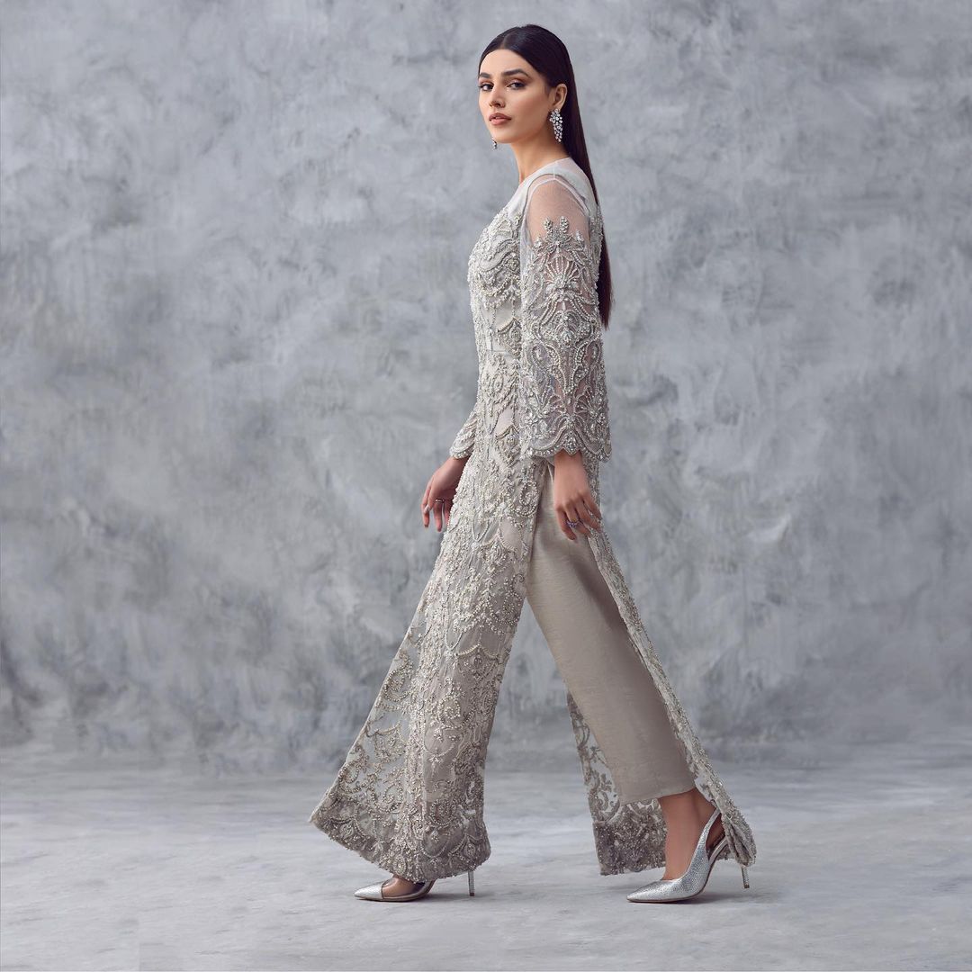 A sleek cut that narrates modernity and refinement. A delicate tapestry of diamantés, pearls, and sequins spreads out on a captivating silver net fabric. Pure raw silk silver pants add the final touch to this ensemble.