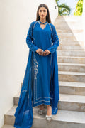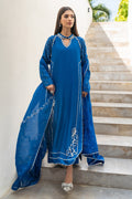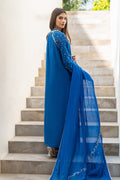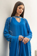 Draped in electric blue, this ensemble features a pure sheesha silk shirt and tailored straight pants. Adorned with pearls, crystals, and stones, it radiates sophistication. The medium silk dupatta showcases badla embroidery, enhancing its charm. The bold halter neckline adds a contemporary edge, making it perfect for soirées and celebrations.