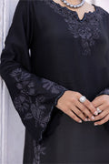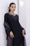 Black raw silk long kurta with a loose fit, paired with culotte pants. The kurta features a cutwork neckline and sleeve details, accented with cutdana edging for added texture. Grey appliqué floral motifs are placed across the front, creating a soft contrast against the black base. A grey organza dupatta, detailed with black appliqué work, adds dimension and completes the look.