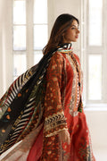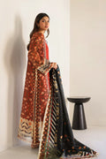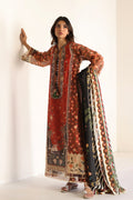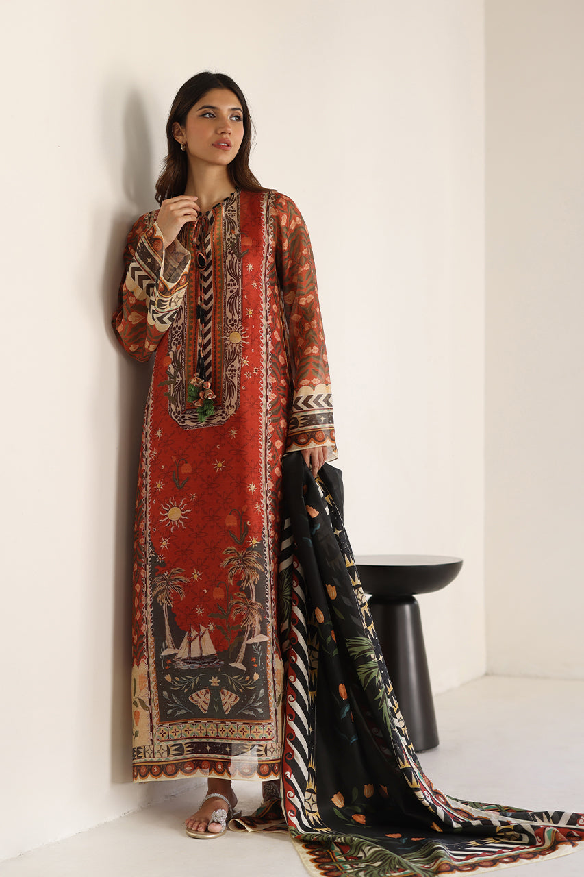 Storytelling is translated through print in this ensemble, blending burnt orange, ebony, and earthy tones into a striking tapestry of heritage and modernity. The flowing silhouette is enriched with intricate patterns inspired by nature and folklore, while a statement ebony-hued medium silk dupatta showcases playful elements on its border and magnified tropical motifs on the pallu. It is paired with matching burnt orange pure rawsilk trousers.