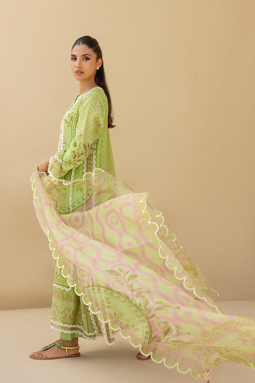 Exuding timeless elegance, this pistachio hued cotton net shirt is adorned with delicate aari embroidery along the neckline and intricate oriental motifs in soft cream and sage tones. Paired with a pistachio flowing organza dupatta, featuring muted orchid toned swirls and verdant accents, framed by scalloped aari embroidery along all four corners. Each corner is elevated with a hand embroidered bouquet of petals, adding a touch of artisanal sophistication. The ensemble is completed with matching pure raw silk culottes for a look that is both graceful and refined.