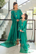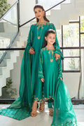 Introducing an exquisite emerald green ensemble crafted from luxurious pure sheesha silk for both the shirt and pants, paired with a stunning paper cotton Banarsi dupatta featuring pure embroidered organza borders. This dress is a masterpiece of intricate embellishments, with handworked sequins, kora, dabka, naqshi, crystals, stones, and pearls adorning both the neckline and hem, creating beautifully detailed front and back designs. The sleeves showcase elegant pleats and a delicate line of sparkling stones, adding an extra layer of glamour to this sophisticated piece.
