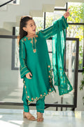 This exquisite emerald green ensemble is crafted from luxurious pure sheesha silk for the shirt and pants, paired with a stunning paper cotton Banarsi dupatta featuring pure embroidered organza borders.