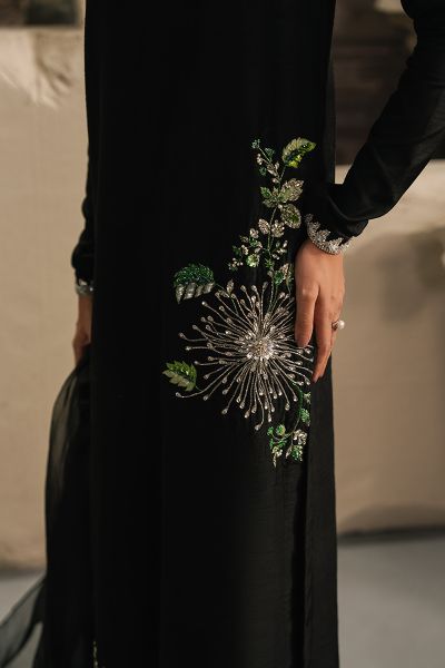Blending chic sophistication with contemporary charm, Esra is a true ode to modern minimalism. The pure black raw silk shirt is brought to life with intricately composed floral motifs, enriched by craftsmanship through sequins, crystals, and pearls. Paired with sleek pure raw silk cigarette pants, the look is elevated by its organza dupatta the statement piece of the outfit adorned with exquisitely embellished 3D leaves that exude ethereal elegance.