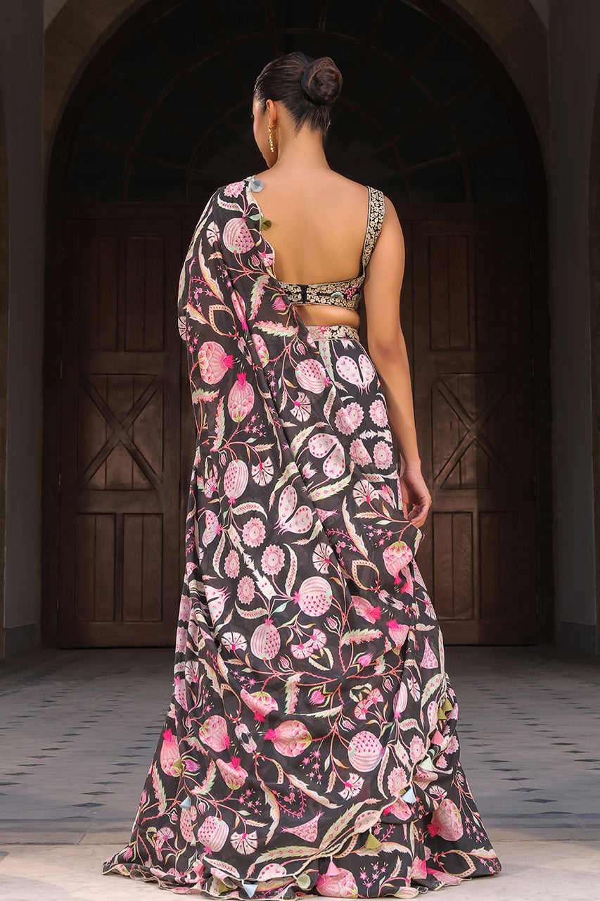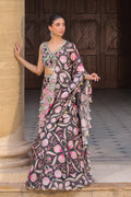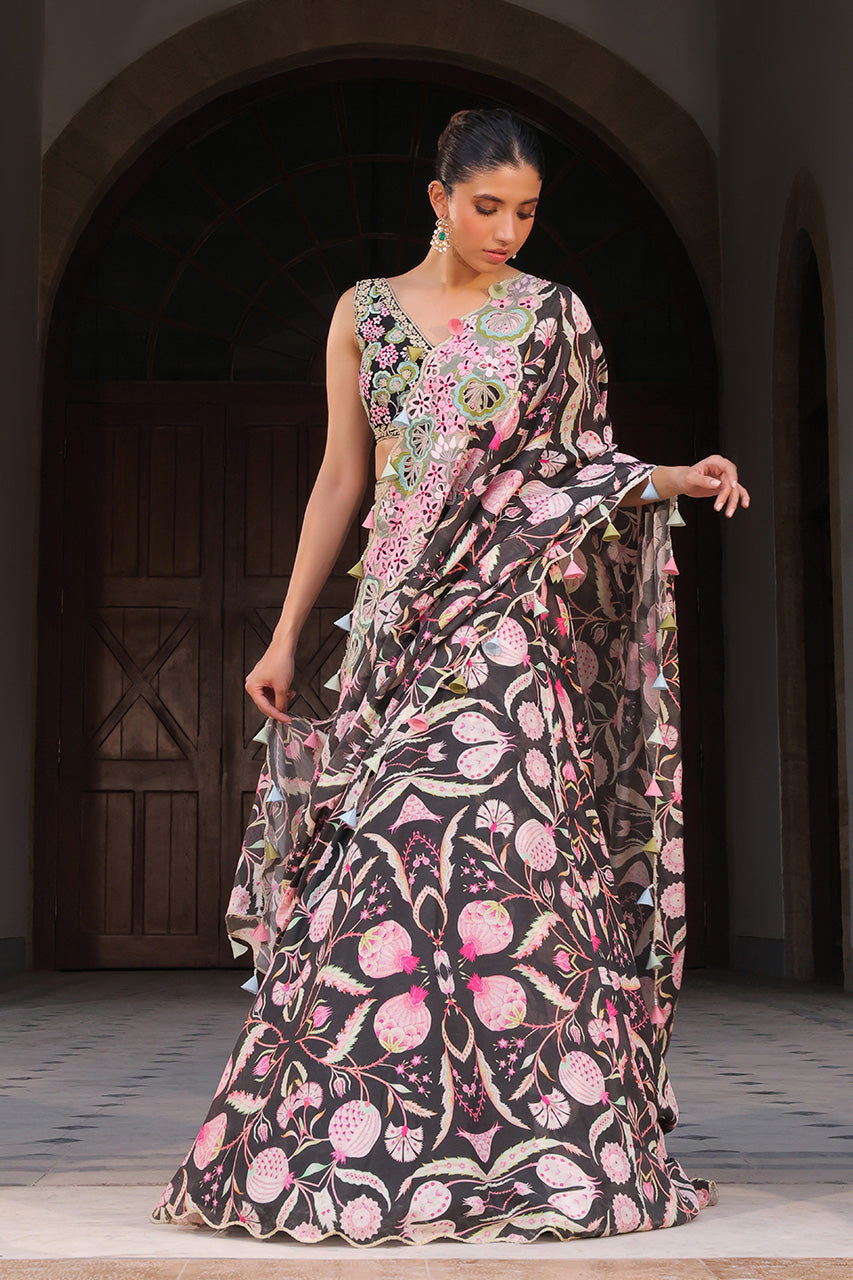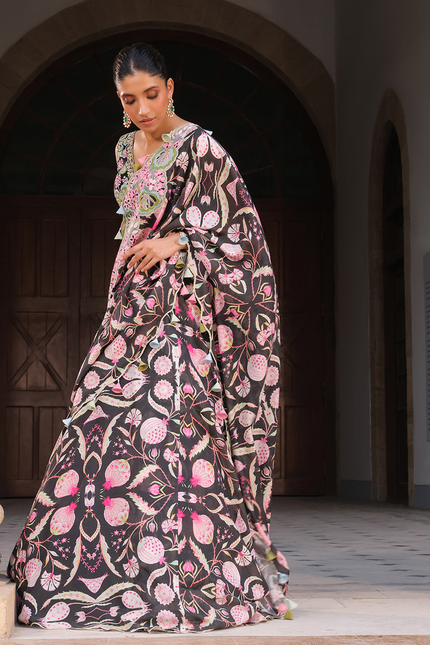 Timelessly feminine, this deep V-neck blouse in pure ebony rawsilk is hand embroidered with artisanal florals in sorbet pinks, mint, sage and eggshell threadwork. It is paired with a flared khaddi silk skirt in the same inky hue, blooming with a botanical print. A flowing pre draped dupatta mirrors the pattern and is edged with delicate eyelet scallops, lending an artfully festive charm.