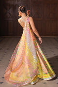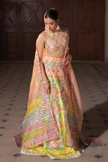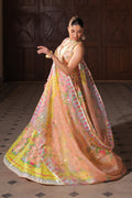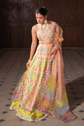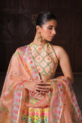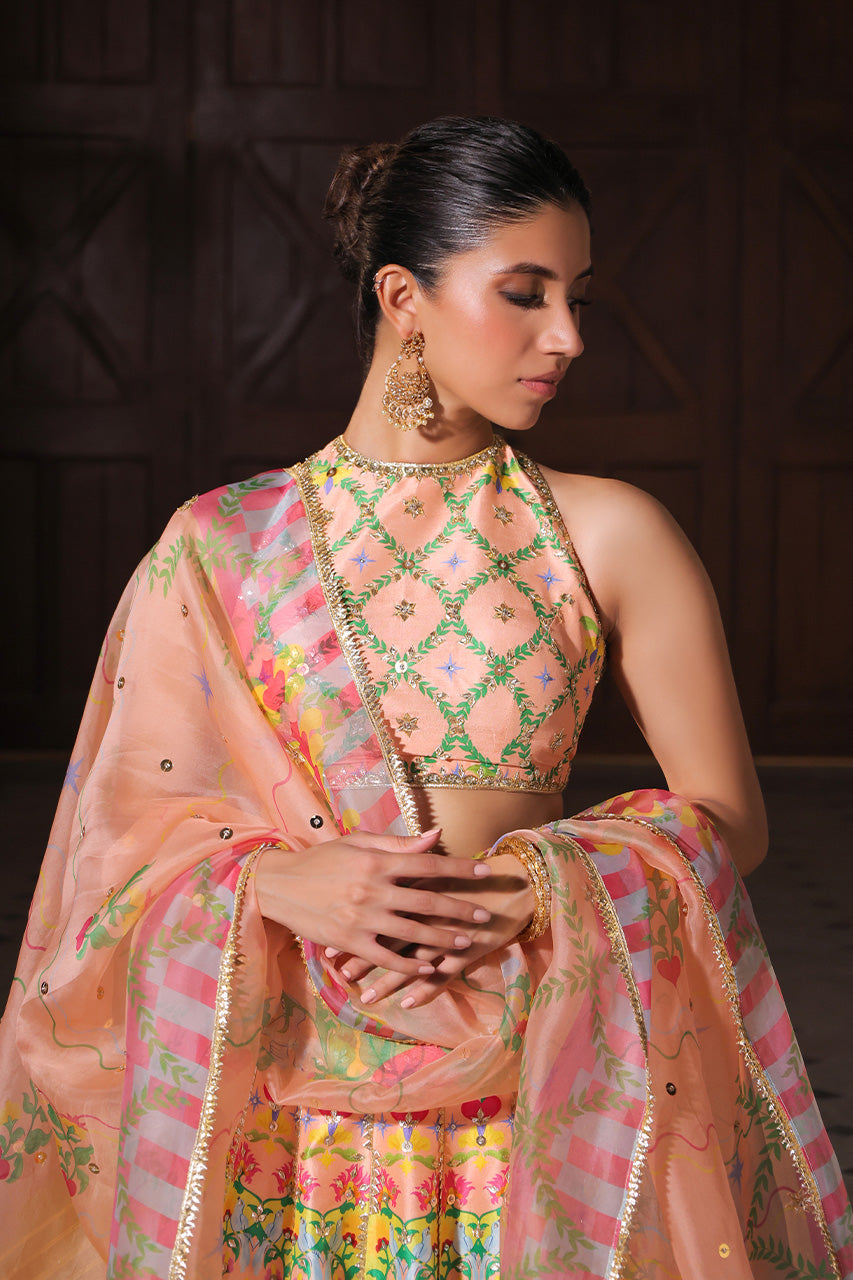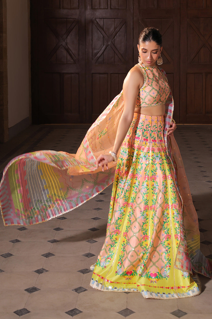 A halter style pure rawsilk choli in soft pastel hues is delicately accented with zardoze and gota embroidery. It pairs with a matching pure rawsilk lehnga, its panels adorned with ornate floral trellises and luminous citrus undertones framed in intricate gota detailing. A sheer organza dupatta, edged with gota and scattered with whimsical motifs and pastel stripes, completes the look with a nod to modern day regalia.