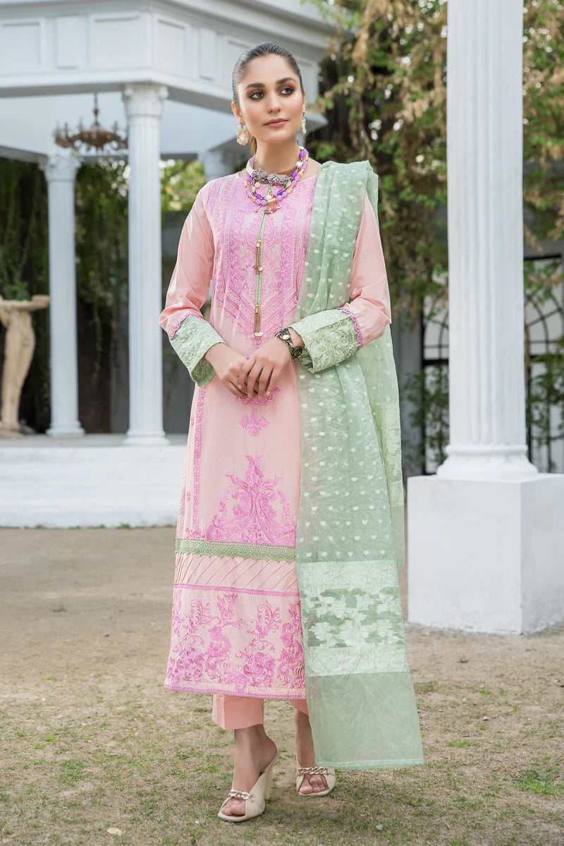 •Fabric: Shirt front embroidered on lawn. Shirt back plain on lawn, embroidered organza borders , embroidered organza boarder for sleeves, matching pants and mint organza dupatta.