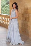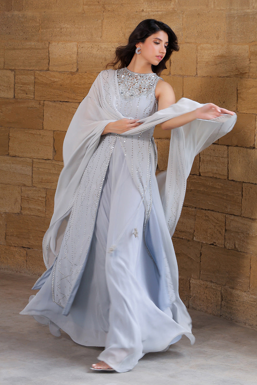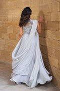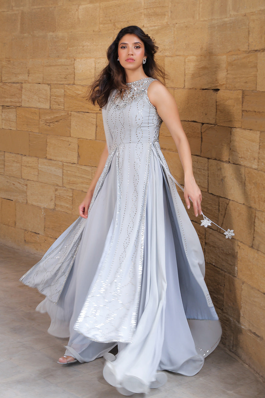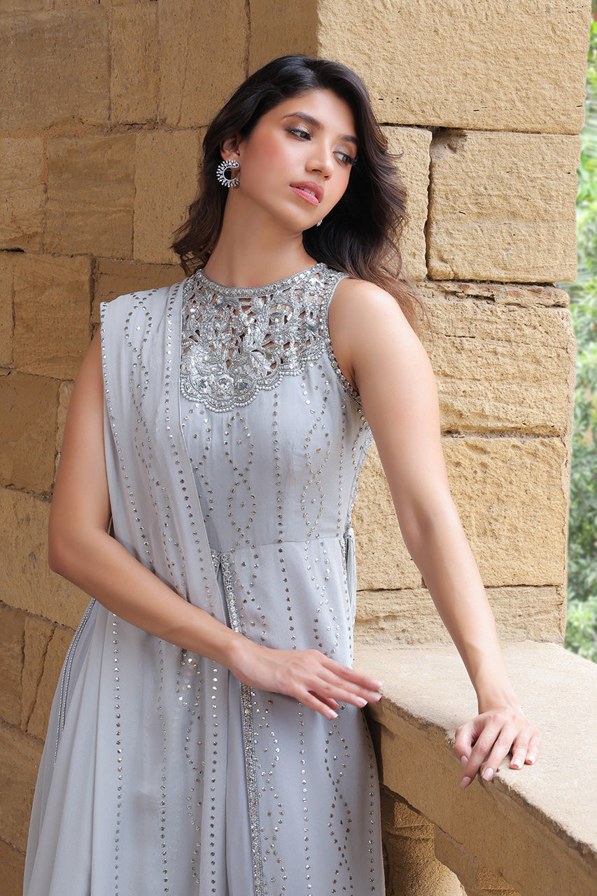 In glacial grey georgette, this front open, multi-layered peshwas cascades in liquid pleats. The upper layer is strewn with kamdani trellises, while 3D tassels accent the side slits, catching the light with every step. Cutwork details, illuminated with zardoze, frame the neckline and back with quiet opulence. Beneath, the plain georgette layer billows with graceful volume, its ruffled hem adding a touch of movement. A pre-draped dupatta, edged with delicate borders, completes the look.
