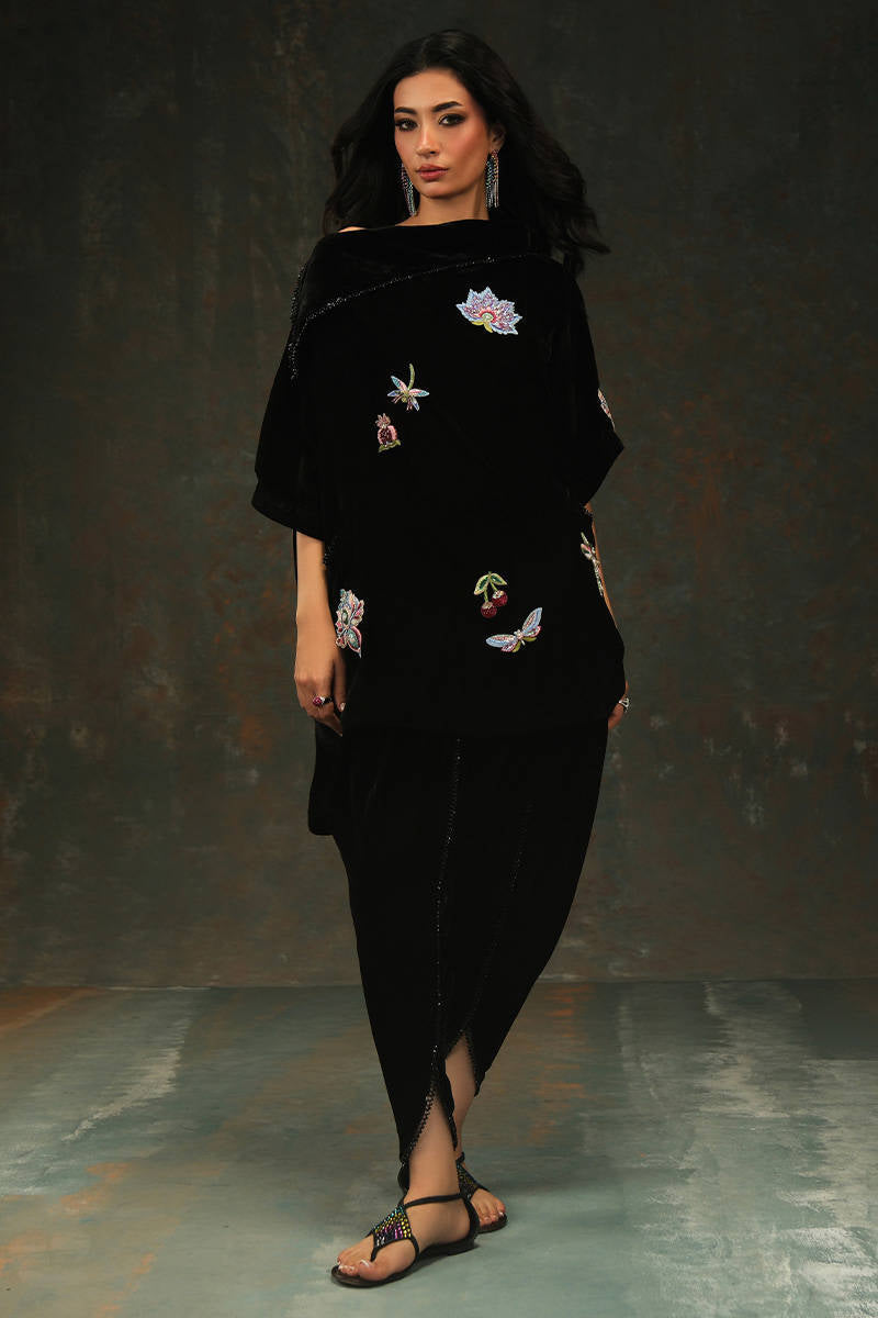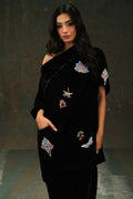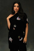 This off-shoulder velvet top features whimsical hand-embroidered motifs inspired by jeweled brooches. A crystal-lined structured neckline and pockets elevate the relaxed yet refined silhouette. Paired with our crystal-detailed velvet tulip shalwar, this looks channels effortless glamour with a fun, fashion-forward twist. The collar can be worn in a regular/non-off shoulder way as well