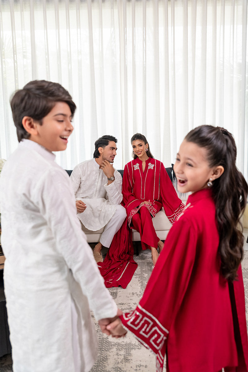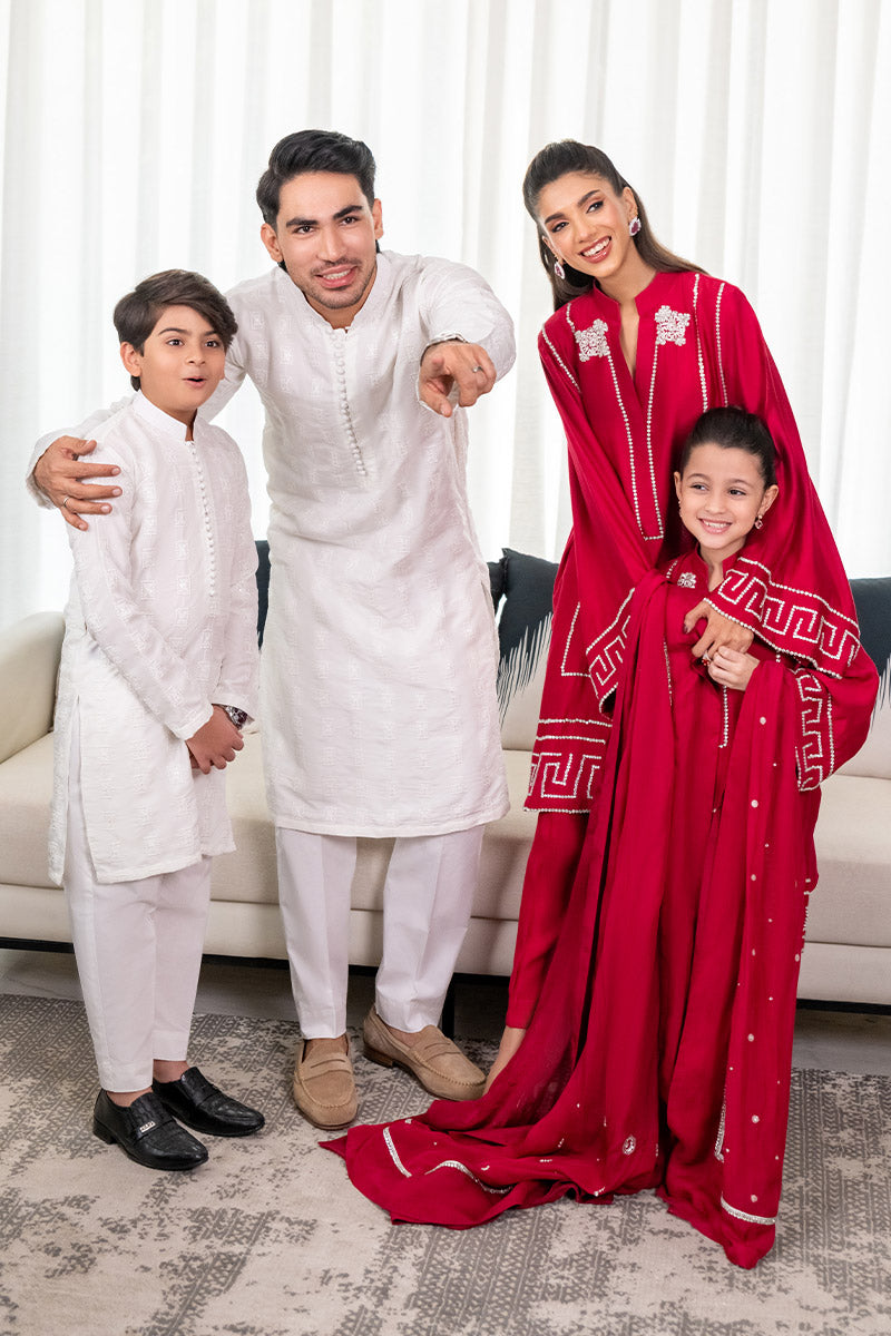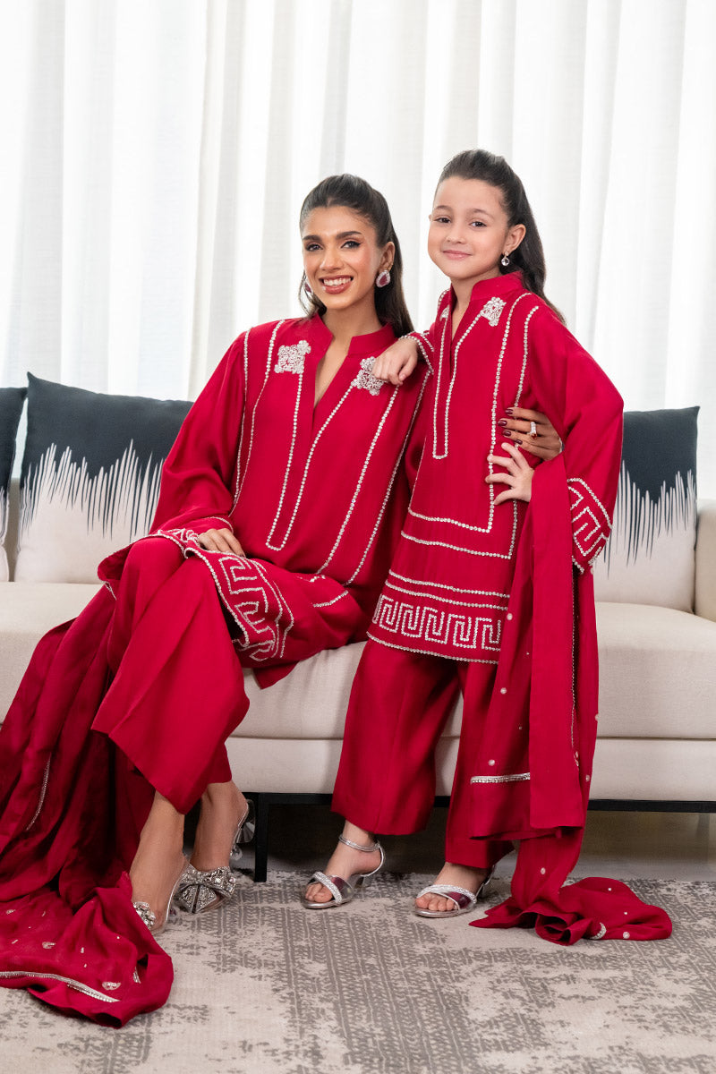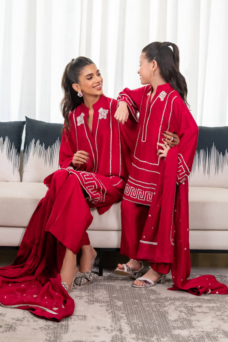 Presenting a striking fuchsia pink ensemble crafted from pure sheesha silk for both the shirt and pants, exuding a rich and elegant feel. The look is completed with a medium silk dupatta, adorned with an embellished border. The shirt features intricate hand-embellished stones and cutdana work enhancing the neckline, borders, and sleeves, adding shimmering elegance. Perfect for festive occasions and evening soirées.