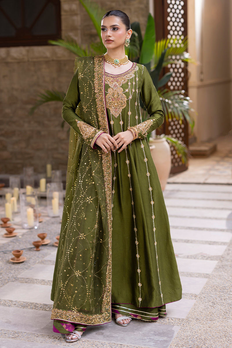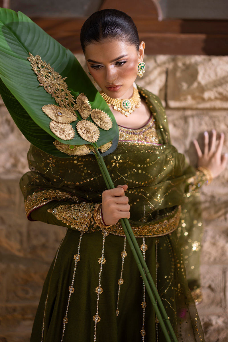 An elegant olive green khaadi silk kalidar paired with a classic izaar, radiating understated sophistication. The kalidar features fitted sleeves and is adorned with intricate hand embellishments in dabka, zari, nakshi, and zardozi, highlighted with delicate magenta accents that add a vibrant contrast to the earthy tone. The look is completed with an ethereal organza net kamdaani dupatta, finished with lavish hand-embellished borders, bringing together tradition and refinement in perfect harmony.