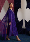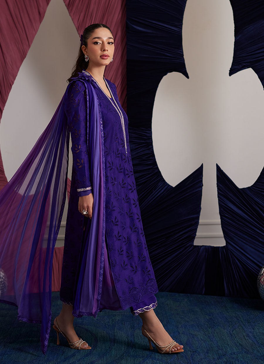 This indigo three-piece outfit exudes sophistication and glamour, crafted from pure raw-silk schiffli. The shirt features a beautifully embellished neckline, adorned with diamanté and sequins for a subtle yet captivating sparkle. The puff sleeves are similarly embellished around the cuffs, adding a touch of refined detail and enhancing the overall elegance of the design. The chiffon dupatta is dyed in three stunning shades of purple, creating a gradient effect that perfectly complements the indigo tone of the shirt. It is secured with a hand-embellished corsage and finished with an intricate embroidered border, elevating the ensemble's luxurious feel. The izaar is equally exquisite, featuring a matching border embellished with diamanté and sequins, tying the look together with a cohesive, dazzling finish. This ensemble blends intricate details with timeless elegance, making it an ideal choice for any formal occasion