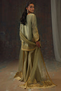 Bathed in the warm glow of antique gold, the lustrous tissue gives the outfit a regal sheen. The shirt is adorned with exquisite gota work, its intricate patterns gracing the neckline, sleeves, and hem in a harmonious display of craftsmanship. The flared sharara pants echo the same rich tones, enhancing the grandeur of the silhouette. The net dupatta, with heavy yet intricate gota embroidery and brocade corners, completes the look—an opulent choice for weddings where heritage meets high elegance.