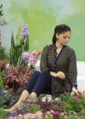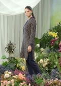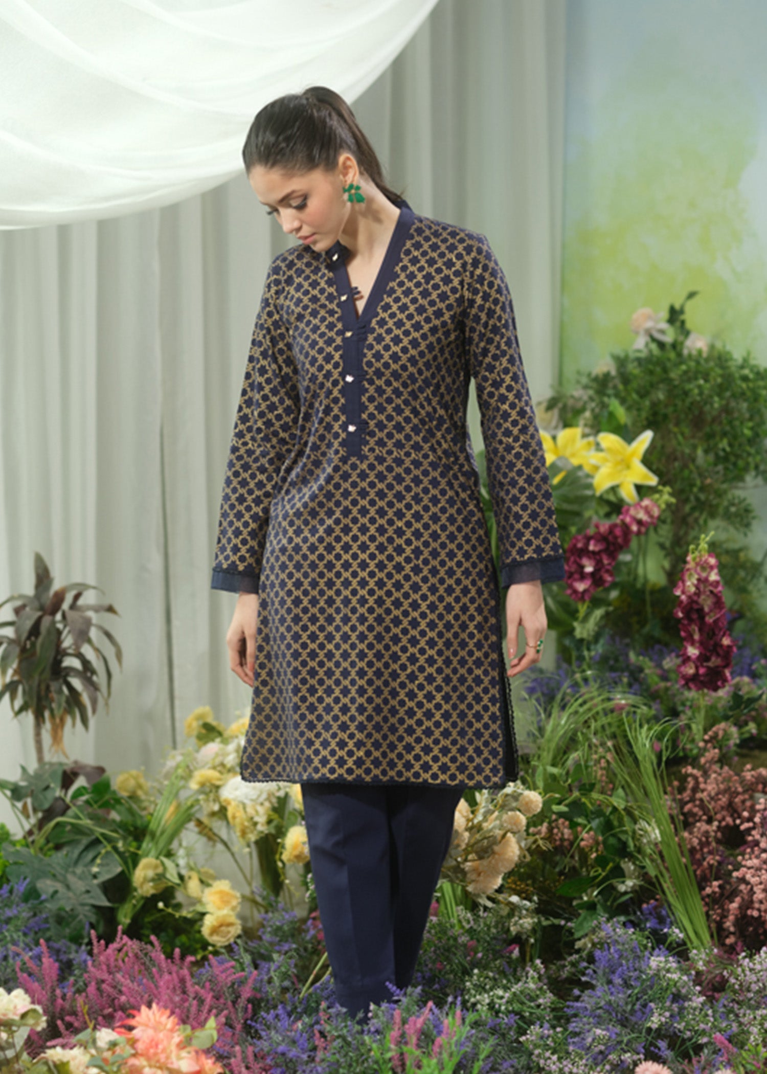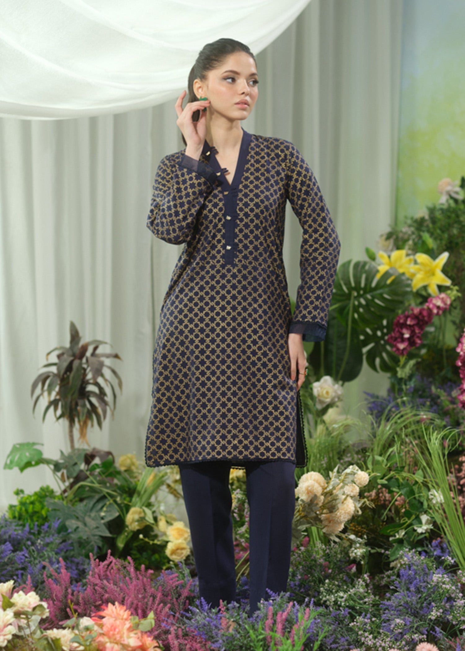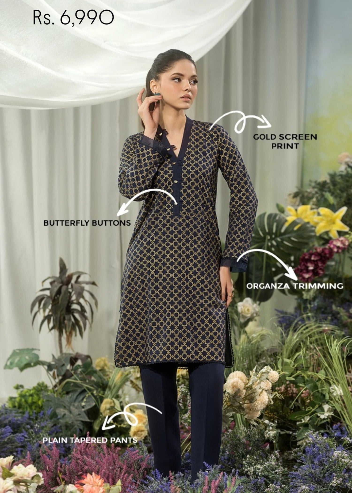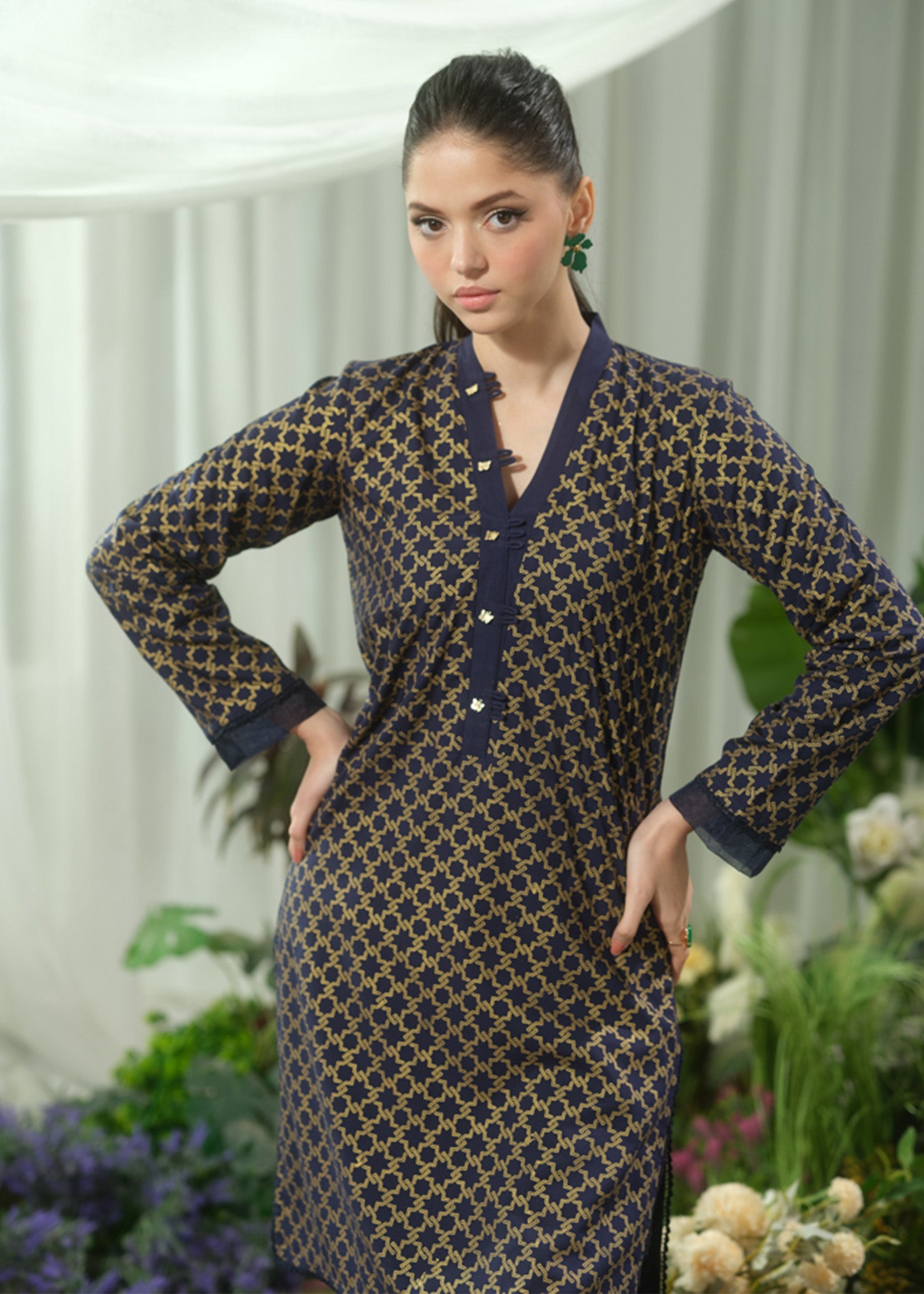 This elegant navy shirt features intricate gold screen printing, creating a stunning contrast between the deep blue fabric and the shimmering accents. The shirt is paired with sleek, tapered pants, offering a modern, flattering silhouette. A perfect combination of regal charm and contemporary style, this outfit is ideal for both formal and semi-formal occasions.