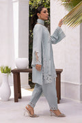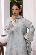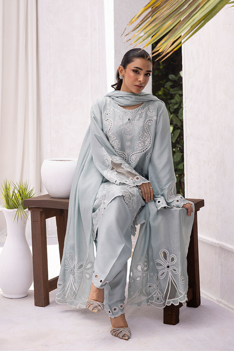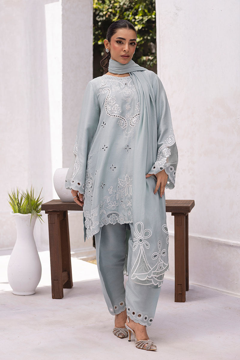 Tinted aqua short shirt made from pure raw silk, paired with a narrow shalwar. The shirt features ivory schiffli embroidery and delicate detailing across the body, with unique organza details along the back and sleeves. The medium-weight silk dupatta is finished with cutwork detailing along the pallu, creating a refined look.