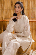 An ivory khaddi silk cord set featuring a cutwork crew neckline and bell sleeves for a balanced blend of structure and fluidity. The bootcut pants are finished with Schiffli embroidery, cutwork, and appliqué detailing, creating depth and texture throughout the ensemble.