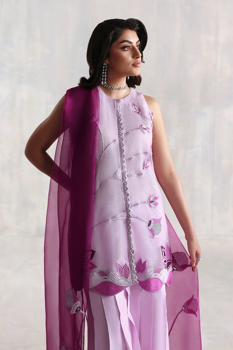 Rendered in a soft lilac hue, this short shirt is crafted from airy cotton net, offering a breezy and elegant silhouette. It is paired with tailored Korean raw silk pants for a polished contrast, while a pure organza dupatta adds a delicate, graceful finish. Perfect for festive gatherings or intimate celebrations, this ensemble captures effortless sophistication.