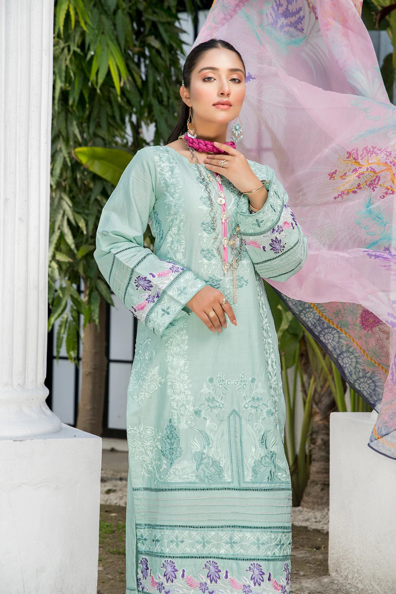 •Details:Fully Embroidered shirt front on lawn with embroidered organza and lawn patti for sleeves, with matching pants with embroidered organza borders hem while paired with printed pure silk dupatta.