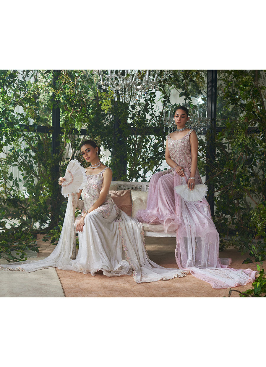 It is paired with an exquisitely embellished pure net dhaka, and a beautifully shaded ombré net dupatta in soft pink and white tones. The dupatta is delicately edged with lace, enhancing its ethereal charm. A timeless ensemble, perfect for intimate festivities or elegant soirées.