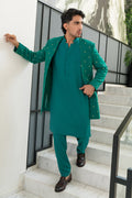 Introducing an exquisite ensemble featuring a prince coat made from embroidered raw silk, complemented by a wrinkle-free polycotton shirt and matching pants. This outfit combines sophistication and comfort, making it perfect for formal occasions. The intricate embroidery on the coat adds a luxurious touch, while the polycotton fabric ensures a crisp and polished appearance.