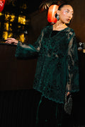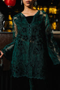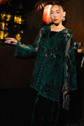 A luxurious front-open organza jacket featuring soft scalloped edges, enriched with velvet appliqués and intricate hand-embellished detailing. The shimmering cutdana and sequin work add a refined sparkle, elevating the jacket’s airy elegance. It is paired with a rich velvet bandeau and matching wide-leg velvet pants, creating a striking contrast of texture and sophistication. A contemporary yet opulent ensemble perfect for evening glamor.