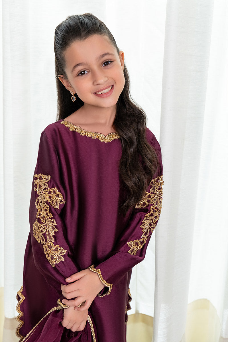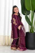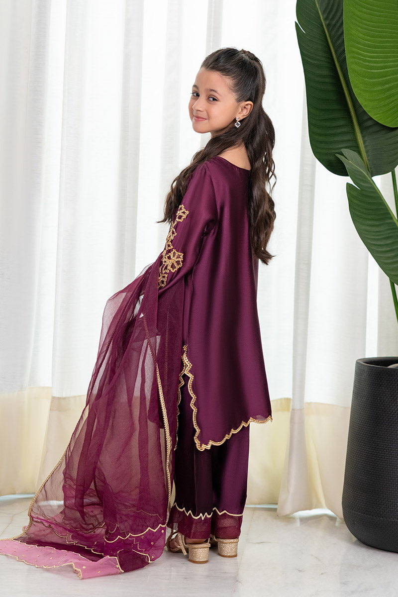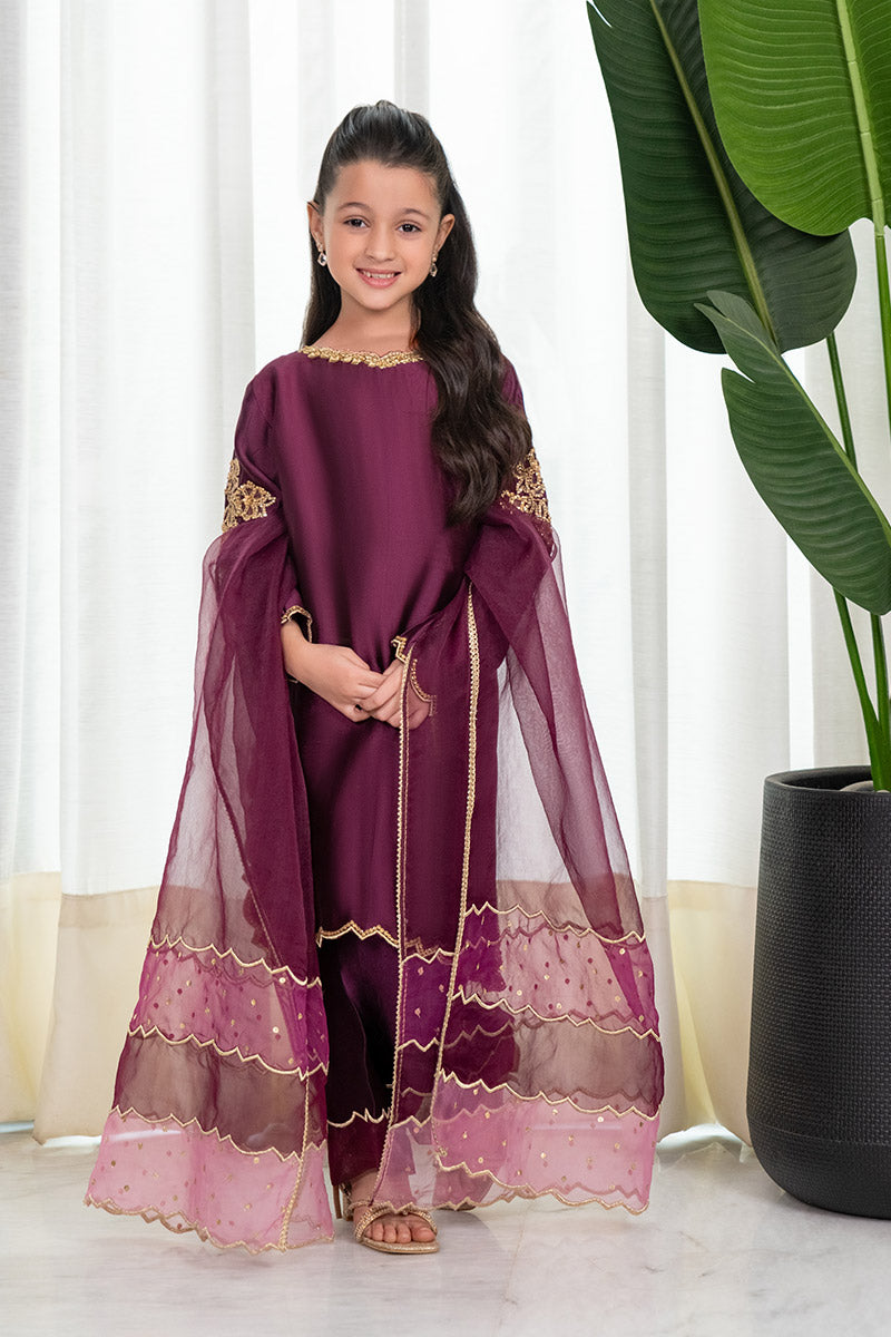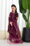 Drenched in a rich plum hue, this exquisite ensemble is crafted from sheesha silk for both the shirt and pants, exuding a luxurious feel. The look is beautifully completed with a delicate organza dupatta, adorned with a sprinkle of sequins and contrast-colored borders, adding a refined touch. The neckline and sleeves are intricately embellished with kora, dabka, and stones, showcasing fine craftsmanship. The pants feature elegant embroidery, enhancing the overall grandeur of the outfit.