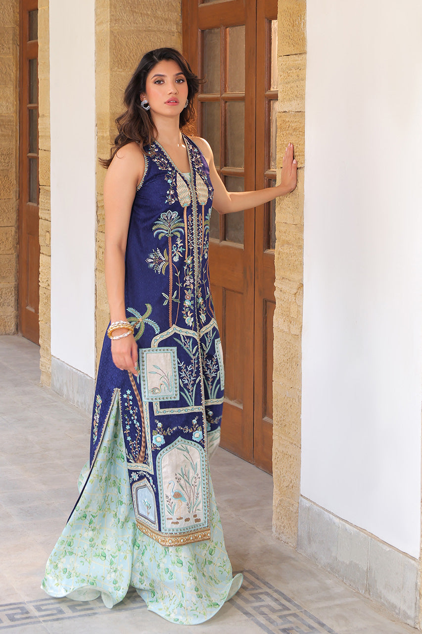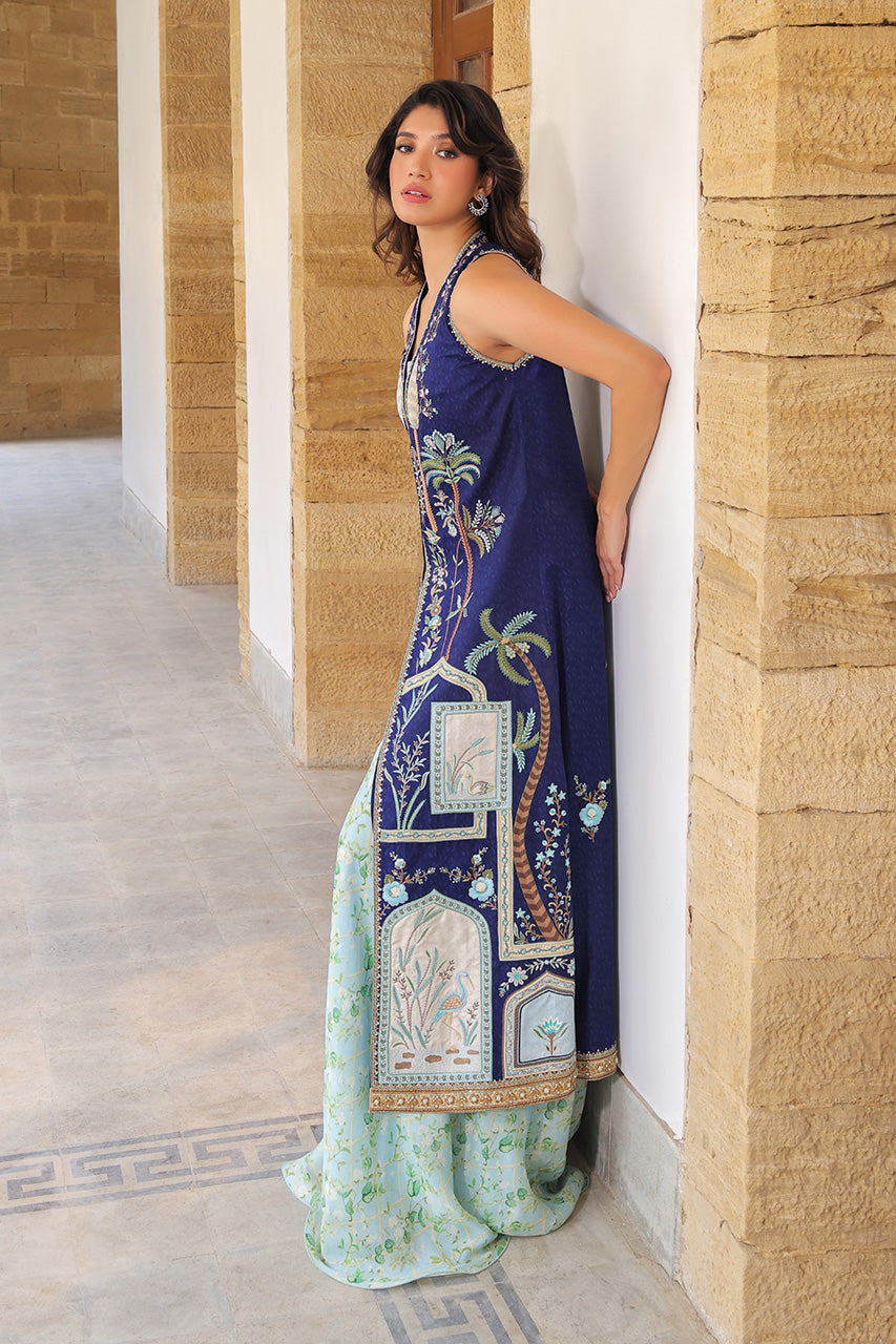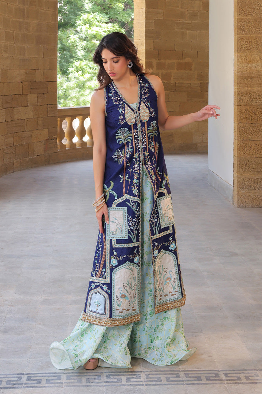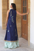 A deep sapphire A-line sleeveless jacket unfolds in architectural panels of botanical aari embroidery in muted gold, mint, and ivory resham, reminiscent of a regal tapestry elevated with contrasting applique details. The neckline is delicately framed with tonal embellishment, playing against the mint hued painterly printed khaddi silk tube top beneath. Completing the look, flared khaddi silk dhaka pajama in mint blooms with soft watercolor florals, weaving poise with artisanal detail.
