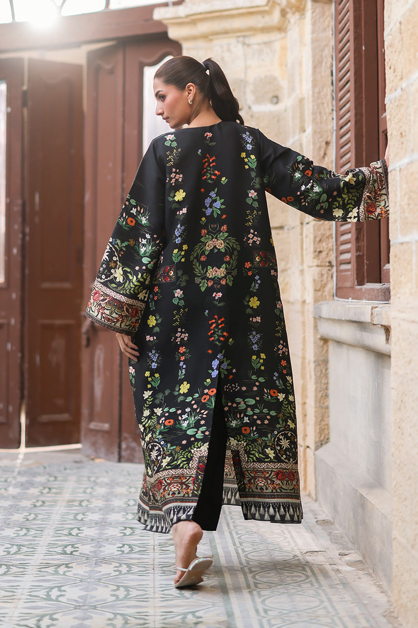 An ebony hued flowing kaftan with a floral painterly print exudes vibrance on the relaxed silhouette. Crafted from pure rawsilk, the kaftan features a slit in the front and a tie closure. Paired with pure rawsilk matching culottes.