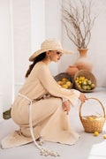 A breezy raw silk kaftan with a unique resham embroidery on the front and an interesting embroidery drop on the back. The look is complimented by an artisanal braided rope belt with stunning tasselled details, cinching the waist for an even versatile look.