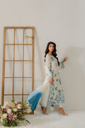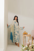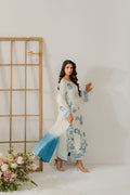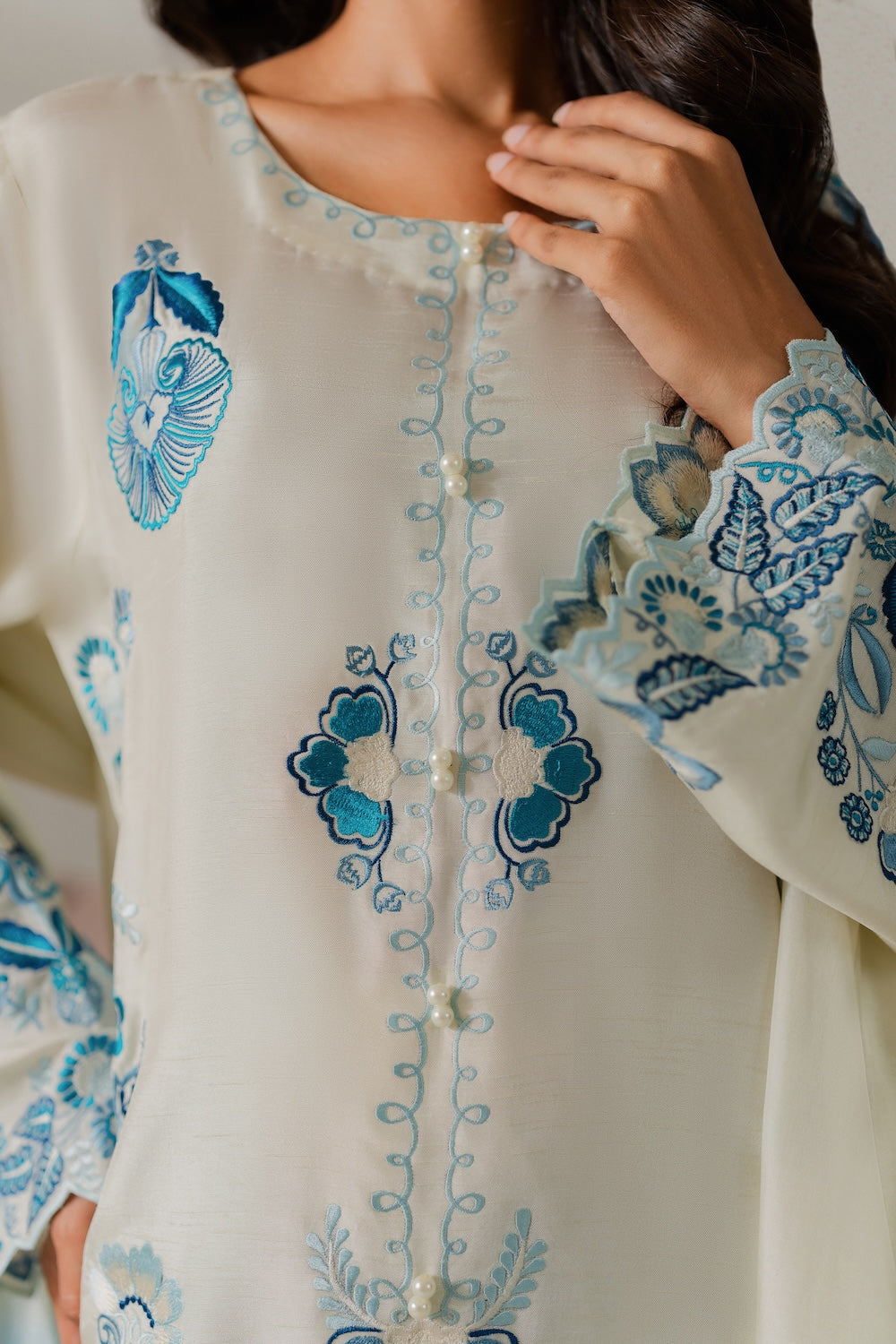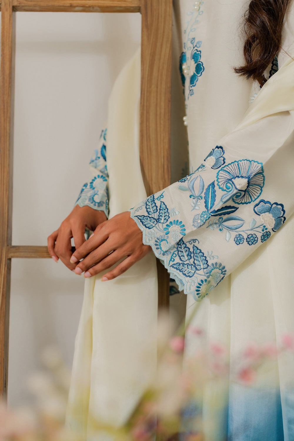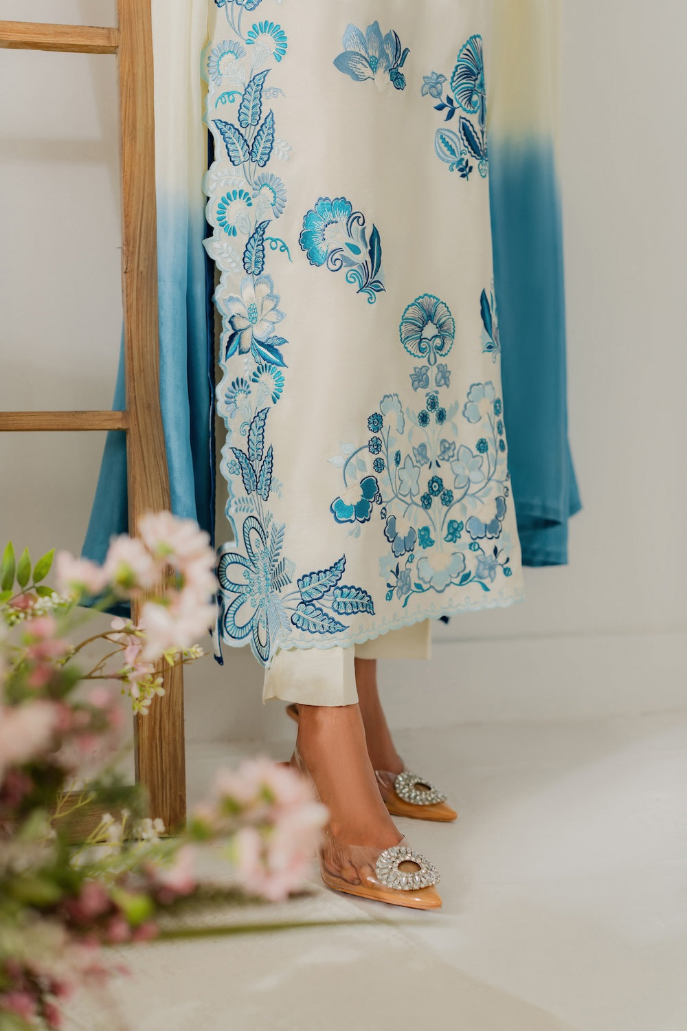 This elegant off-white two-piece outfit is crafted from luxurious Korean silk, known for its smooth texture and graceful fall. The shirt is beautifully adorned with exquisite hand-machine embroidery in varying shades of blue, creating a soft yet striking contrast against the subtle base. The embroidery flows delicately across the shirt, blending floral and abstract motifs with refined precision, adding a touch of understated sophistication. Perfect for formal occasions and intimate gatherings, the ensemble is elevated with a pure silk two-toned dupatta, available separately, offering a harmonious blend of tradition and modern flair.