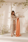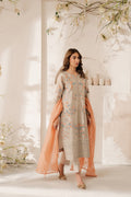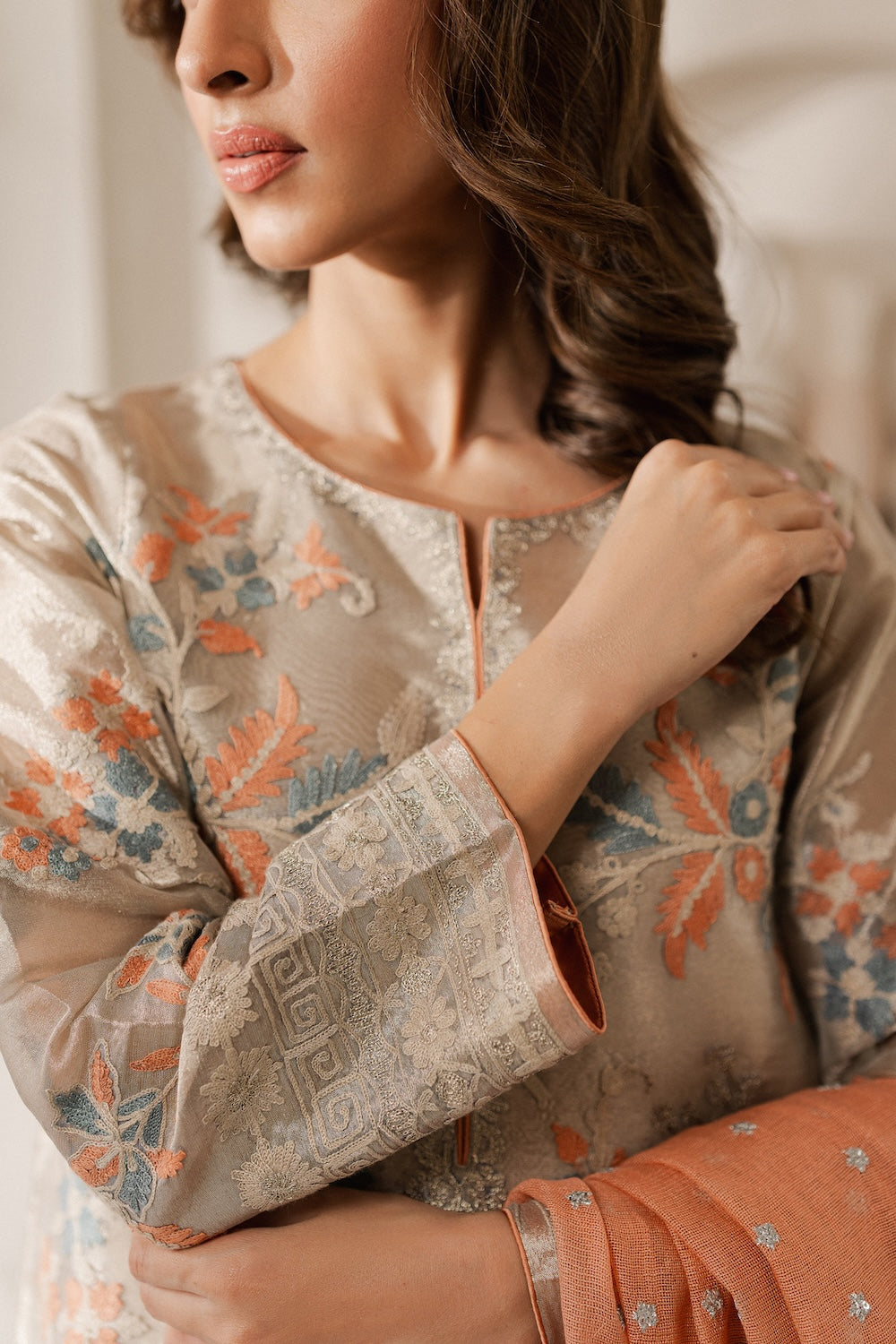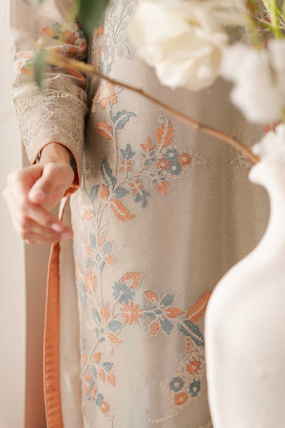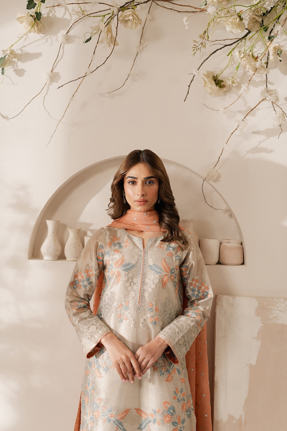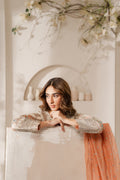 A timeless tale with a contemporary twist, this shimmering tissue ensemble is for the woman, whose love story begins with herself and embraces the world. Beautiful hand-embroidered aari work in the hues of peach and grey on a shimmery ivory base with nature-inspired motifs.