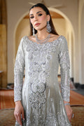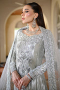 A silver-toned mermaid cut gown crafted from luxurious lama, this piece features a cutwork neckline and an elegant train at the back. The gown is heavily adorned with silver embellishment, sage resham, dabka, moti, tiki stones, sequins, and cutdana for a high-impact shimmer. It comes with a sheer net dupatta, finished with matching border work and delicate chan.