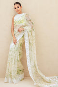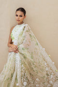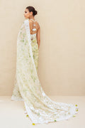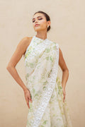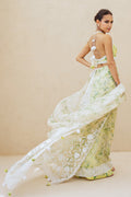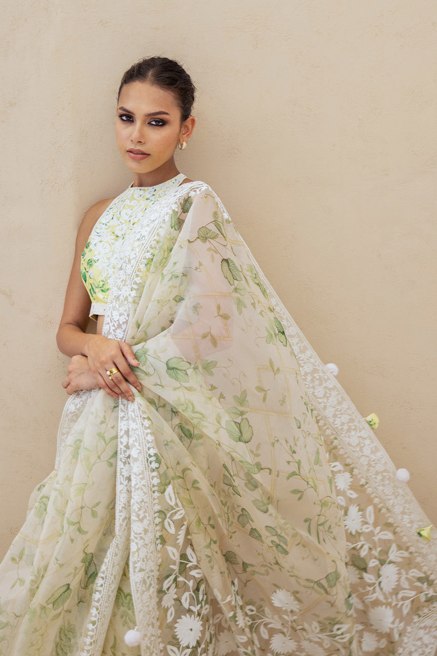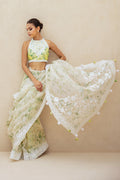 A whisper of ethereal romance, this sari is crafted from gossamer organza, washed in the softest pistachio and ivory blooms. The printed halterneck blouse in pure raw silk shimmers with tonal aari embroidery and 3D embellished tassels cascading down the back. Draped in translucent florals over a printed crepe skirt, the sari is edged with aari borders and delicate blooms along the pallu. Finished with pompoms and fabric tassels, the silhouette moves with modern grace while holding a timeless soul.