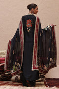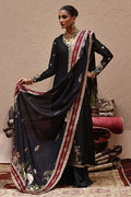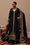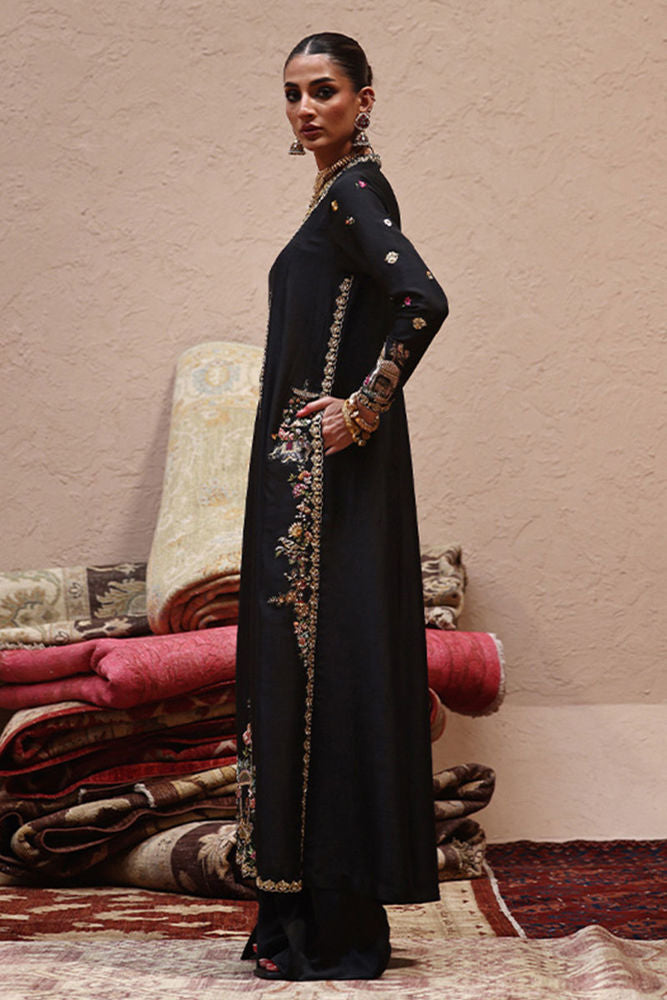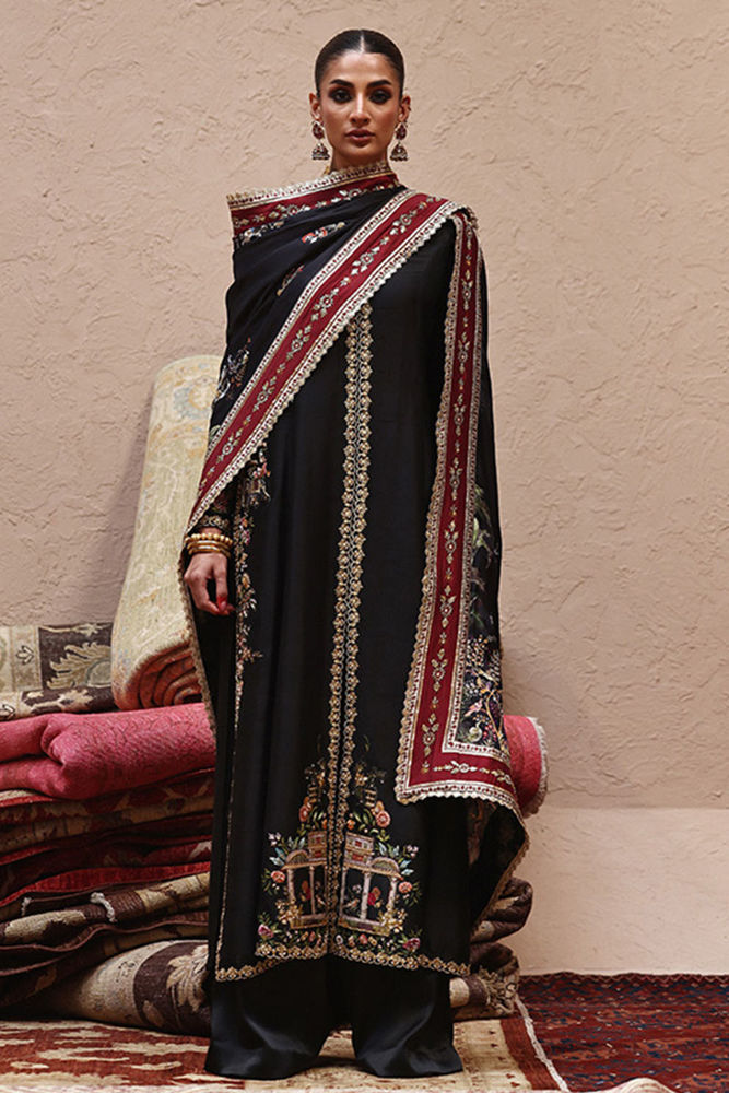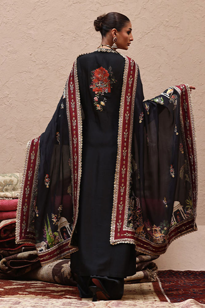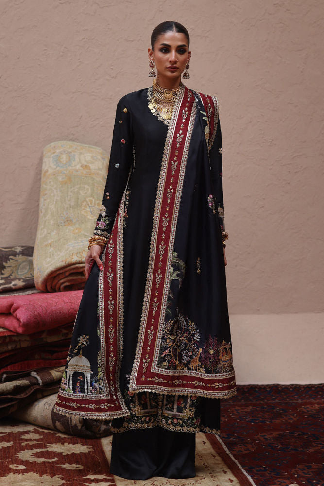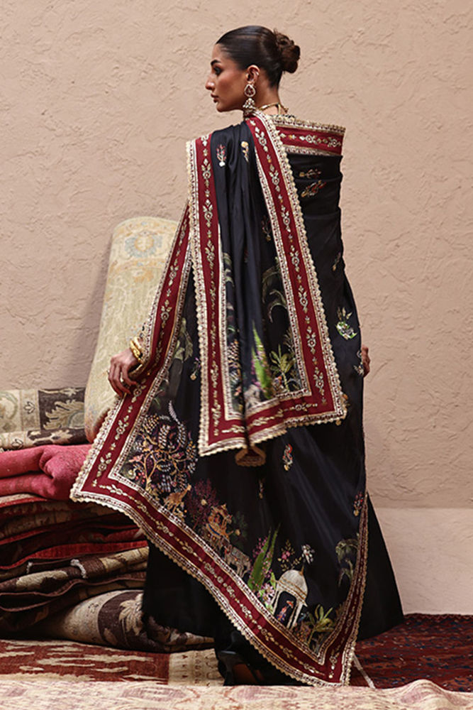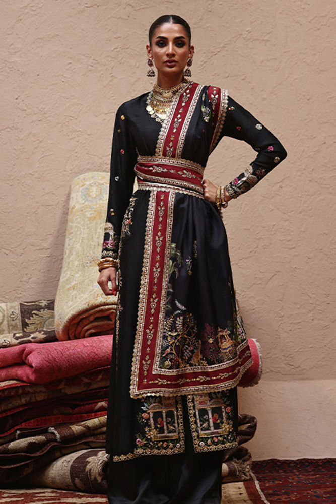 This regal black prince-panel ensemble in pure 80gms raw silk with pockets is adorned with Mughal-inspired digital motifs, resham, zari, zardozi, and intricate embellishments of cutdana, crystals, stones, sequins, dabka, nakshi, and pearls on the front, back, and sleeves. Paired with cotton charmeuse culottes, it balances elegance with comfort. Optional pure silk dupattas include a heavy four-sided gold embroidered bail with motifs, zardozi, and resham botis, or a lighter allover motif version with zardozi and resham botis. An additional black sheesha silk shawl with Mughal-inspired digital print, zari, and zardozi completes the look.