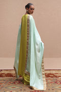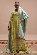Radiant in lime, this straight long shirt in pure 80gms raw silk is beautifully adorned with light and dark gold zari embroidery, antique lame, and intricate zardozi work featuring kora, dabka, cutdana, stones, pearls, nakshi, sequins, and silver bird motifs on the front and sleeves. It pairs with culottes finished with sequins at the hem for subtle shimmer. The look is completed with three dupatta options: an aqua pure medium silk dupatta with a four-sided gold border, an aqua pure organza dupatta with scalloped zari embroidery, sequined handworked border and chan, and a gold lame dupatta detailed with zari embroidery, handworked borders, and banarsi finishing.