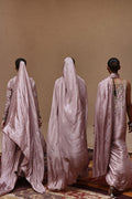 Misty Rose short shirt in pure 80gms raw silk, featuring gold and antique zari embroidery with zardozi work that includes kora, dabka, cutdana, stones, pearls, nakshi, sequins, and mirror on the front, sleeves, and back. Paired with flowy shimmer crush culottes and a pure medium silk dupatta with all-over botis and chan, embellished with pearls, mirrors, and stones.